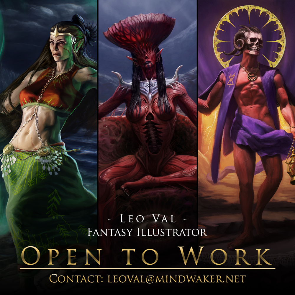 I'm mainly a dark/fantasy art illustrator but I can also do asset work like backgrounds, items, UI, etc. I was also a VFX compositor for 10 years, so if your project needs some advanced (or basic!) video editing and VFX I can probably help with that! (Just as a reminder, Film VFX is very different from Game VFX)