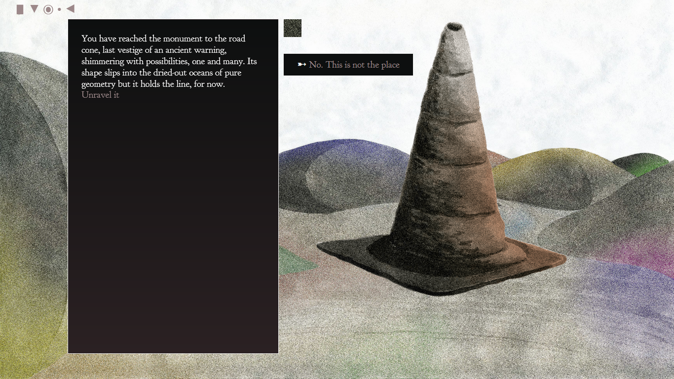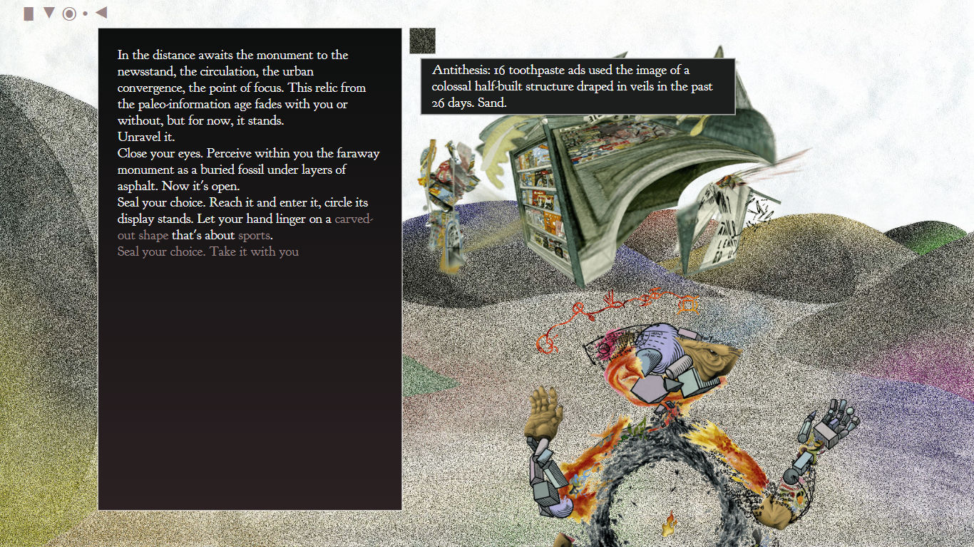 Eight Last Signs in the Desert is an art game made in Twine about the joy of creation, the human drive to create, to make meaning and unmeaning, the overwhelming amount of images released into the world every moment. It's a guided rite to making surrealist poetry. It's a love letters to road cones.