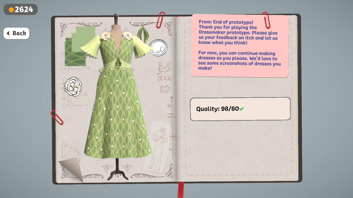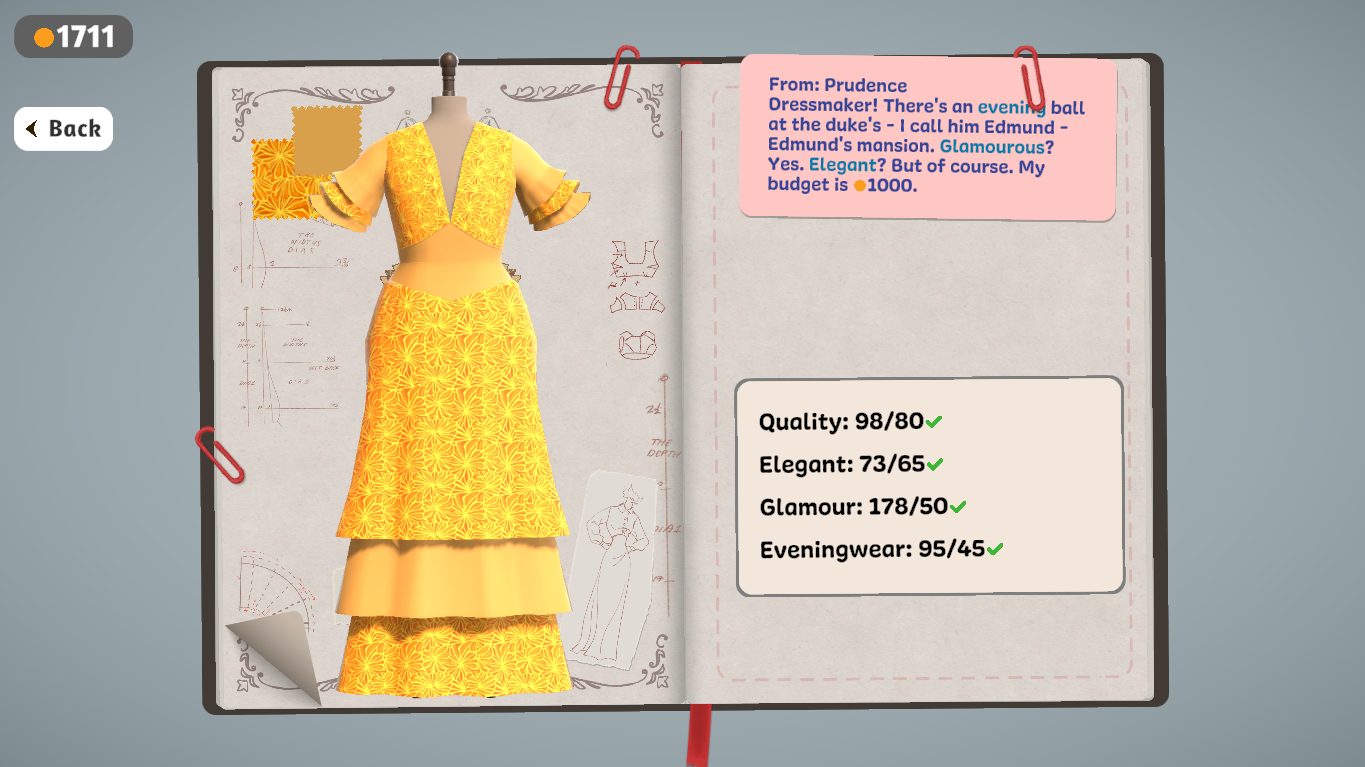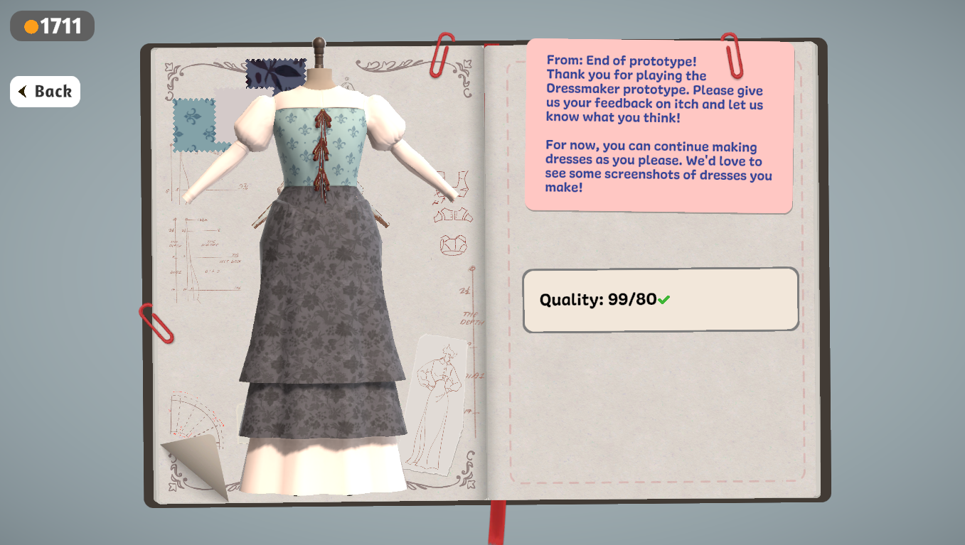 I love this game! I just finished the 0.4.3 prototype. I noticed the accessories clipping. I would love some trims and rubans to decorate the dresses more. Also, when buying fabrics, in the shop, when you have more fabrics than space in the list of your fabrics I can't scroll down to see all of it.