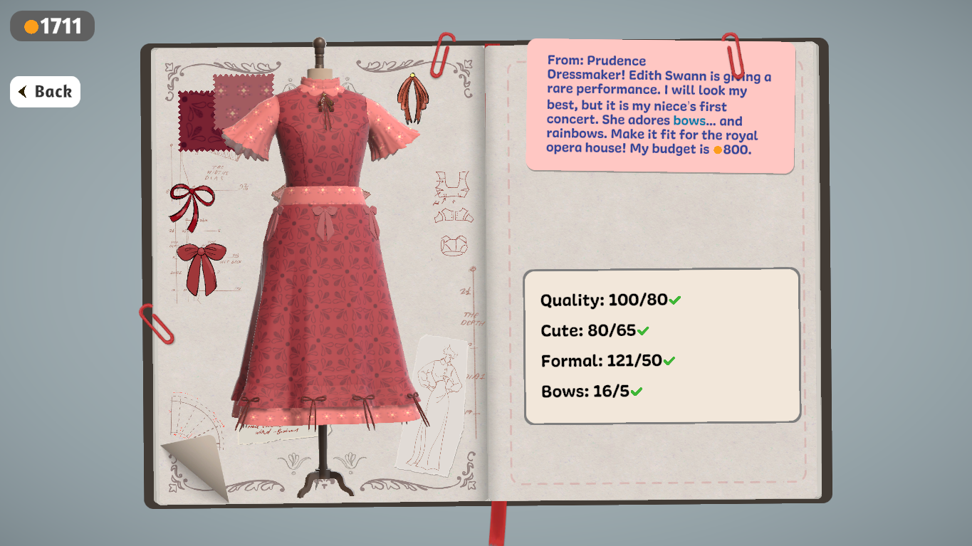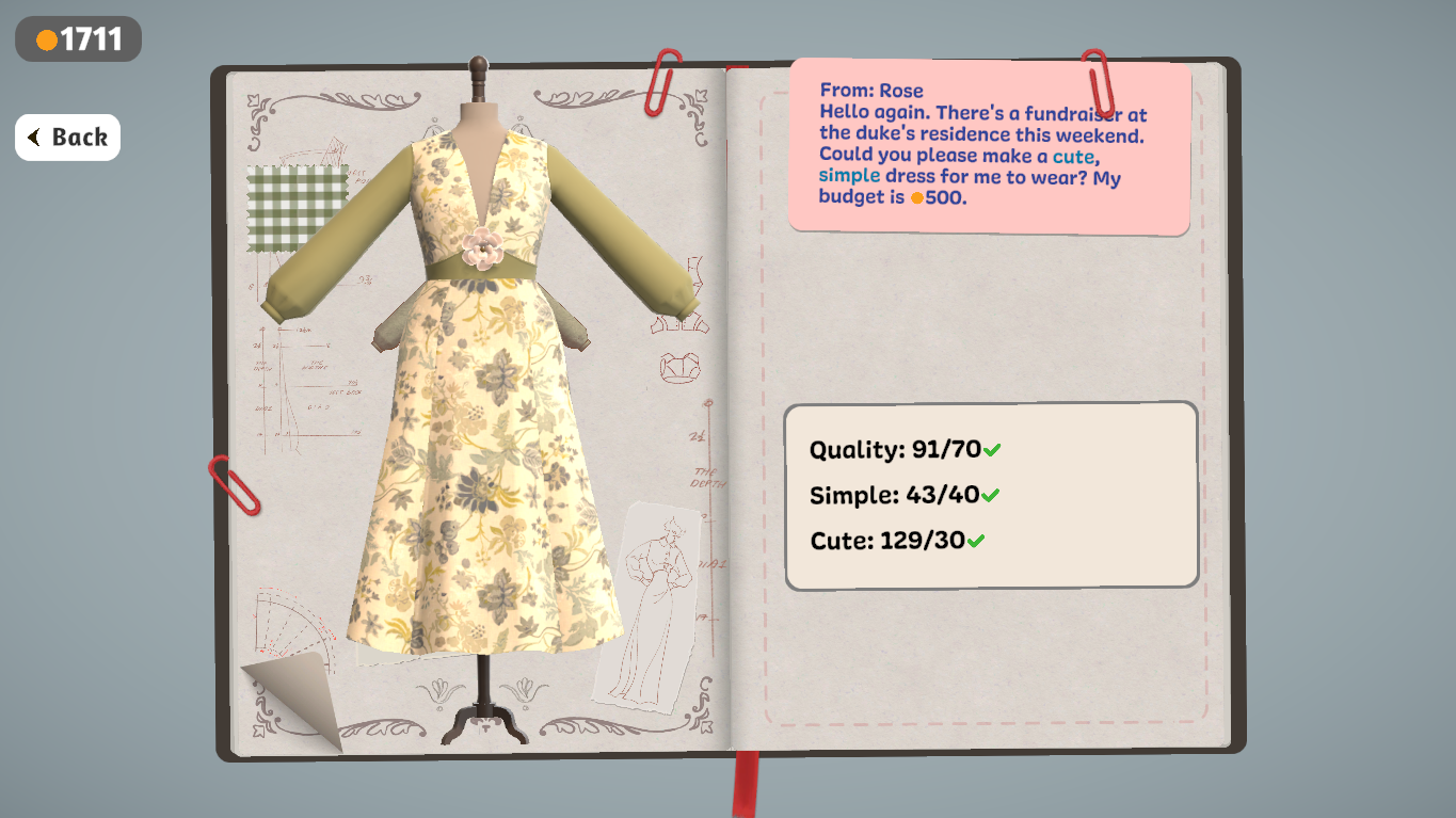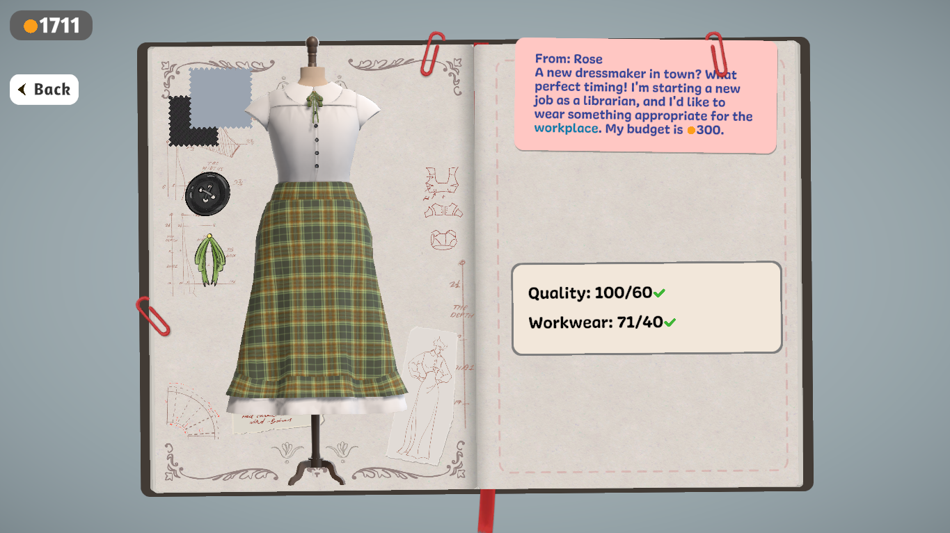 I love this game! I just finished the 0.4.3 prototype. I noticed the accessories clipping. I would love some trims and rubans to decorate the dresses more. Also, when buying fabrics, in the shop, when you have more fabrics than space in the list of your fabrics I can't scroll down to see all of it.