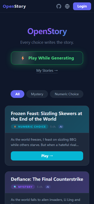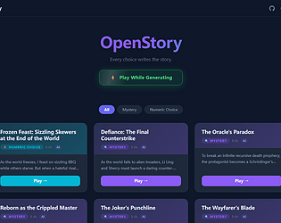 OpenStory is a free, open-source interactive fiction platform powered by AI. Dive into a growing library of stories — or generate your own in under 2 minutes.
