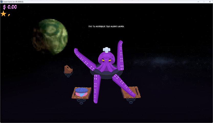When I saw you making this in discord, I just knew I would be terrible at it. I was right. 😂 After several attempts, I finally did make it past the tutorial and into the real game and managed to earn $62. I did find a bug in the tutorial though. If you can't make the food in time, the alien leaves anthe game doesn't progress. No more ingredients come, the text doesn't change, and no other aliens show up. This may have happened to me more than once... 😂 Also, I would have loved a knife respawn button, because sooo many times the knife was floating just out of reach and I had to wait a loooooooong time for it to finally float offscreen so it would respawn. Despite all that, I thought it was super fun and really well done. Very nice entry!