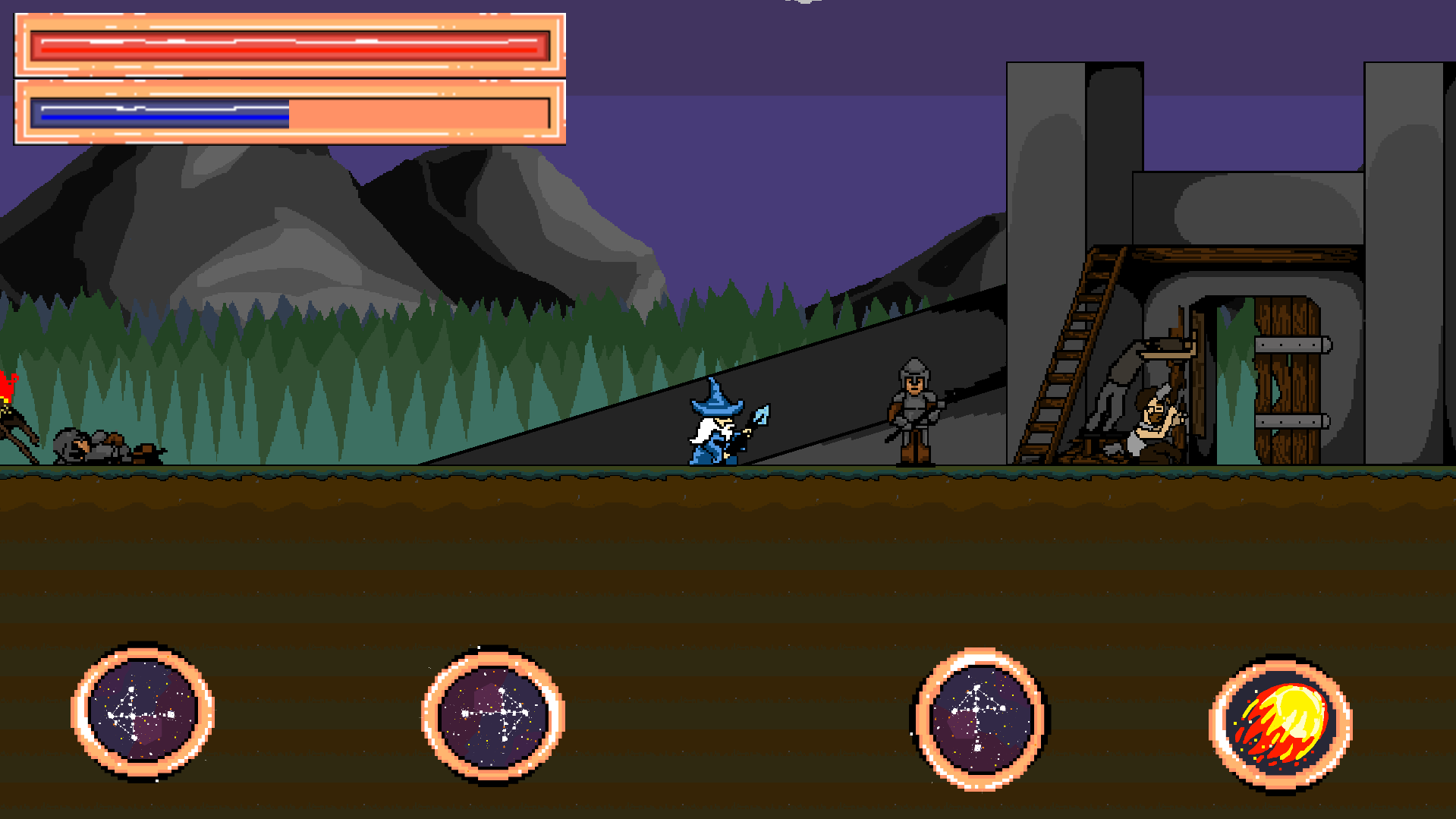 Two dead civilian sprites are included to enhance environmental storytelling, along with basic UI elements like an ammo counter and health hearts.