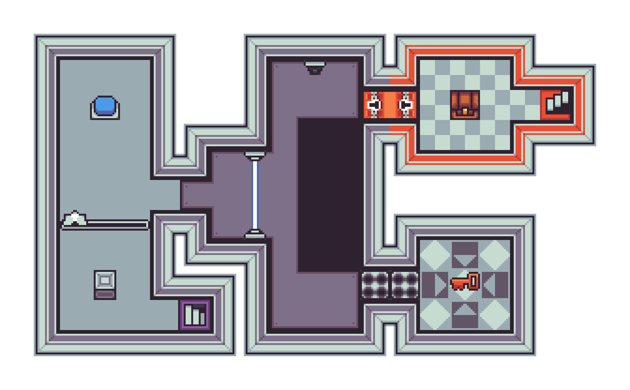 - Buttons, levers, lasers, keys, door, and much systems