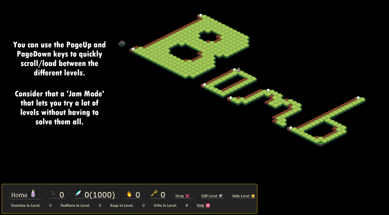 My game has the same thing (a cheat mode of sorts) -- You can use Page Up and Page Down in my game to quickly switch between different levels and try any/all you like that way. There are some surprising levels out there! Also, the '^' key is another cheat mode key that allows you to have a birds eye view without the feather.