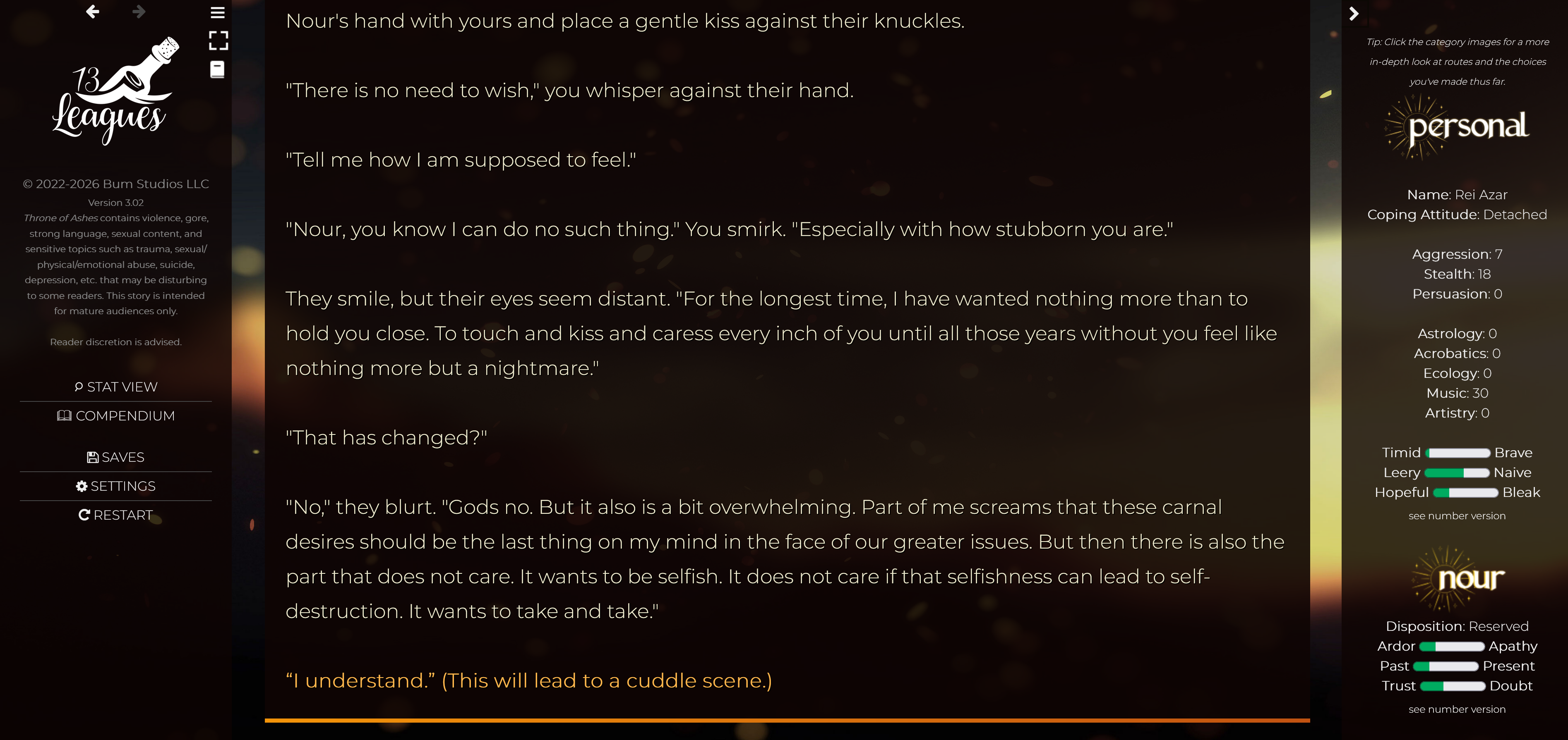 Bug: I only see one option on the page for, what I'm assuming is supposed to be a possible sex scene. Specifically: "(This will lead to a cuddle scene.)"