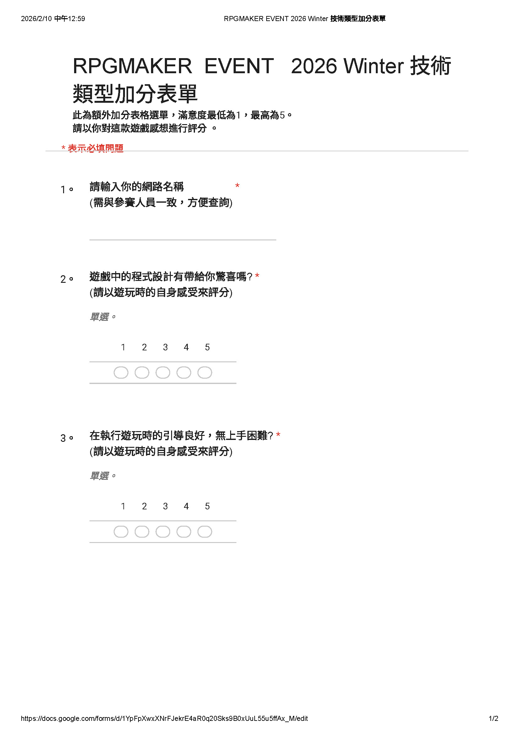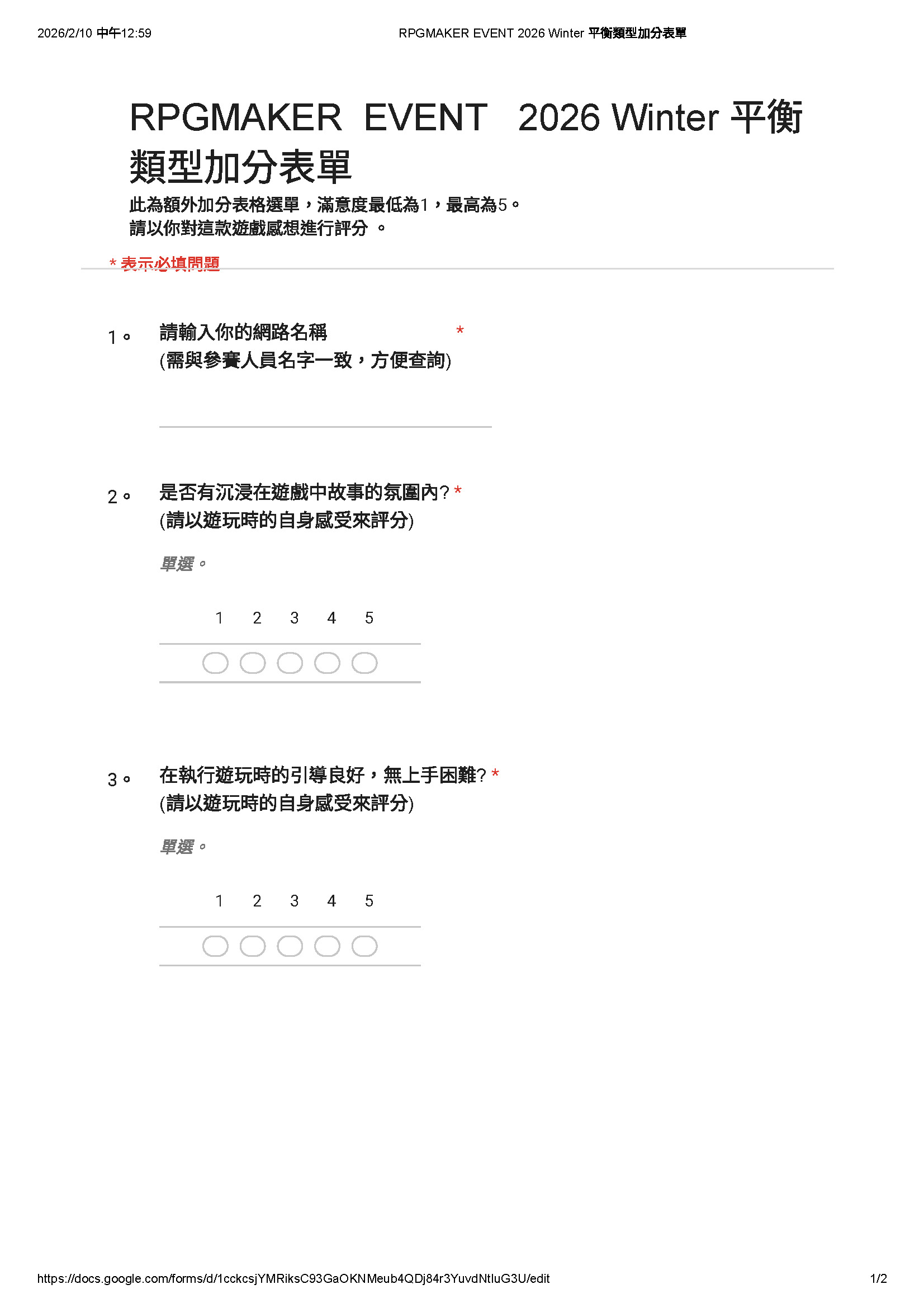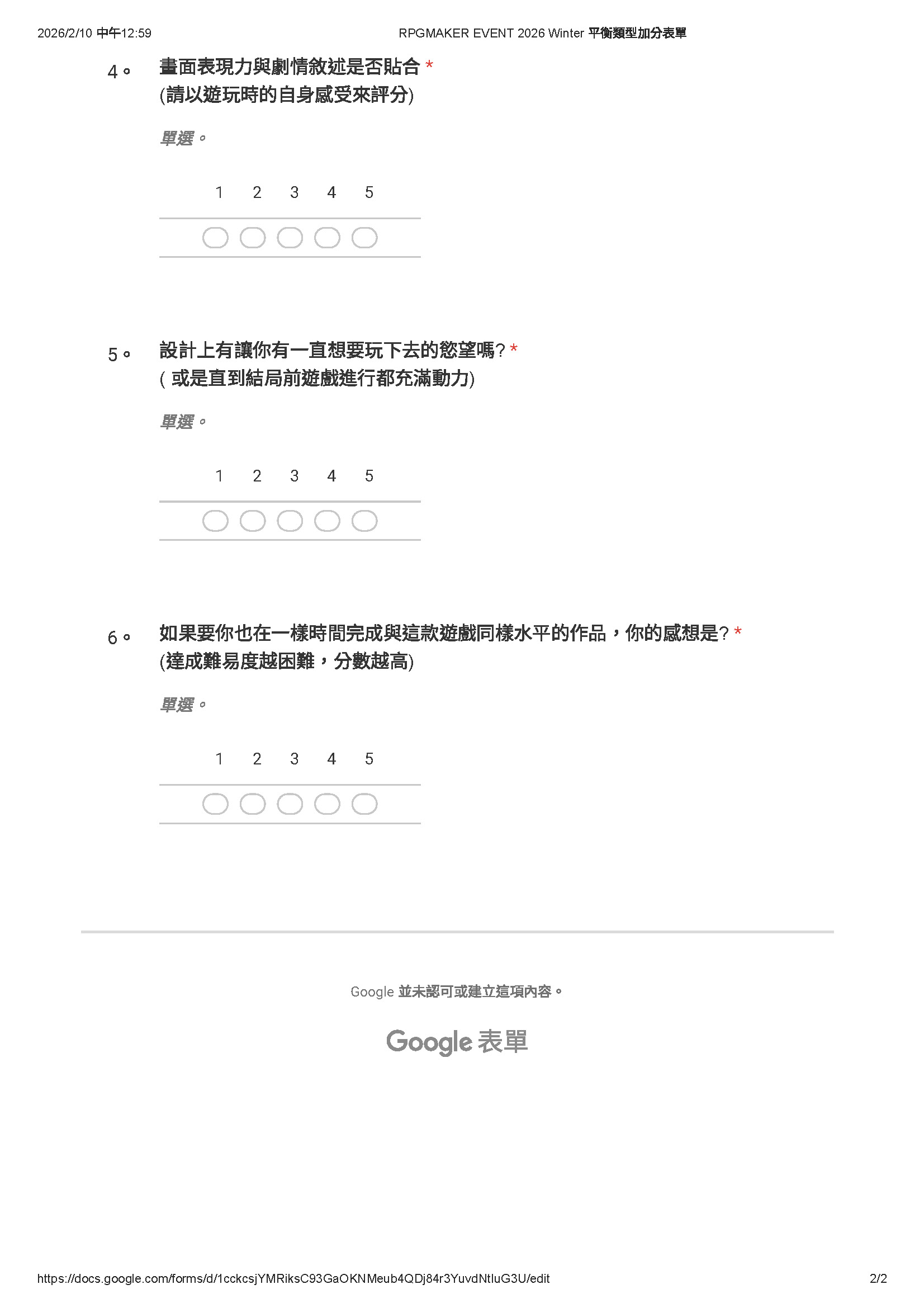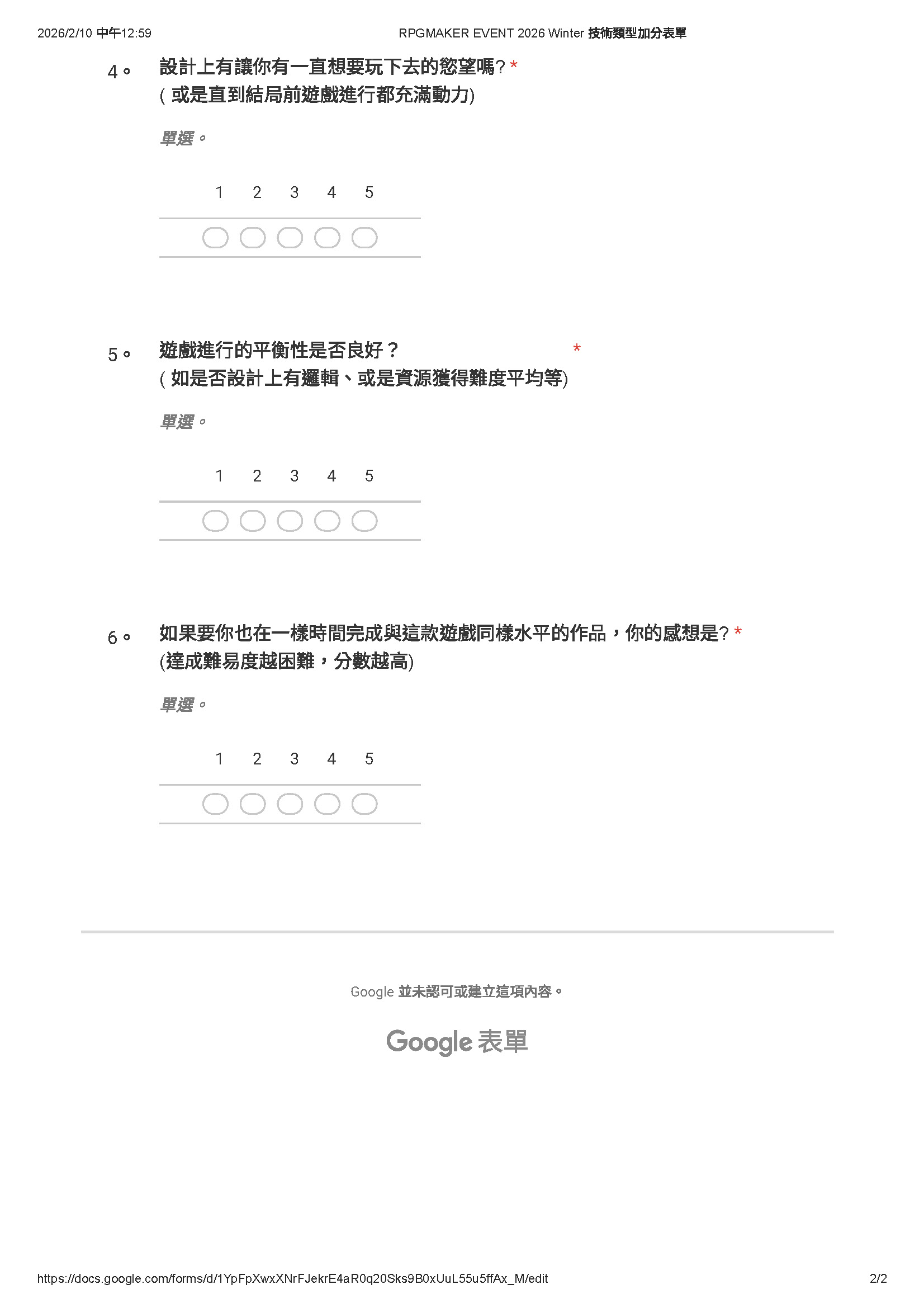 本次活動的評分標準為:itch 基礎分(5 題)/ Google表單加分(5 題),總共10個評分。