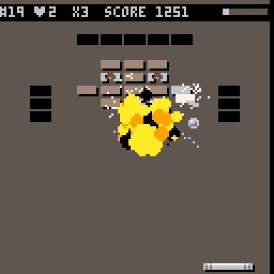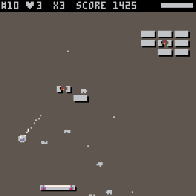 Breakout with a jumping paddle and a laser cannon. Power-ups, chain combos, and time bombs. Made in PICO-8.