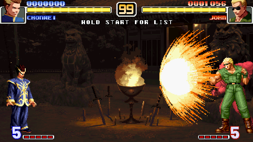 Super fireball from, Chonrei his fireball is reflected, but it still hits Yamazaki. Ash, Adelheid with X button, Dan special fire ball with X button, John his super Fireball with X plus Y buttons, Robert special fire ball with Y button, does not reflect correctly, the ball still causes harm to Yamazaki, Ryo does not reflect fireball with X button , Bao does not reflect fireball with Y button correctly.