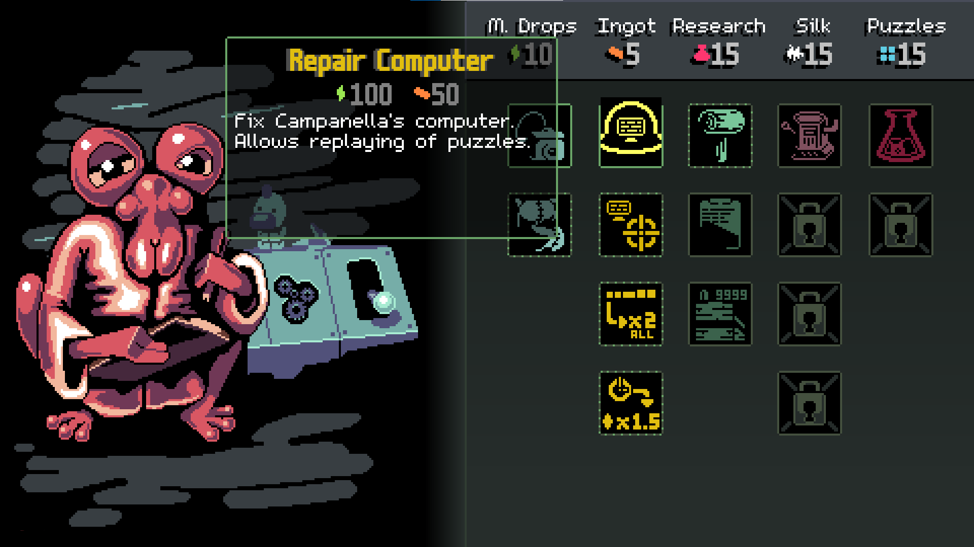 - Resources / Incremental Mechanics: Completing a Nonogram will yield moon drops and moon ingots, and you'll be able to unlock research and silk in the lab by completing more puzzles. There are a few upgrades to unlock, and you will passively increase the amount of moon drops gained from puzzles as the gumma tree automatically produces more plants.