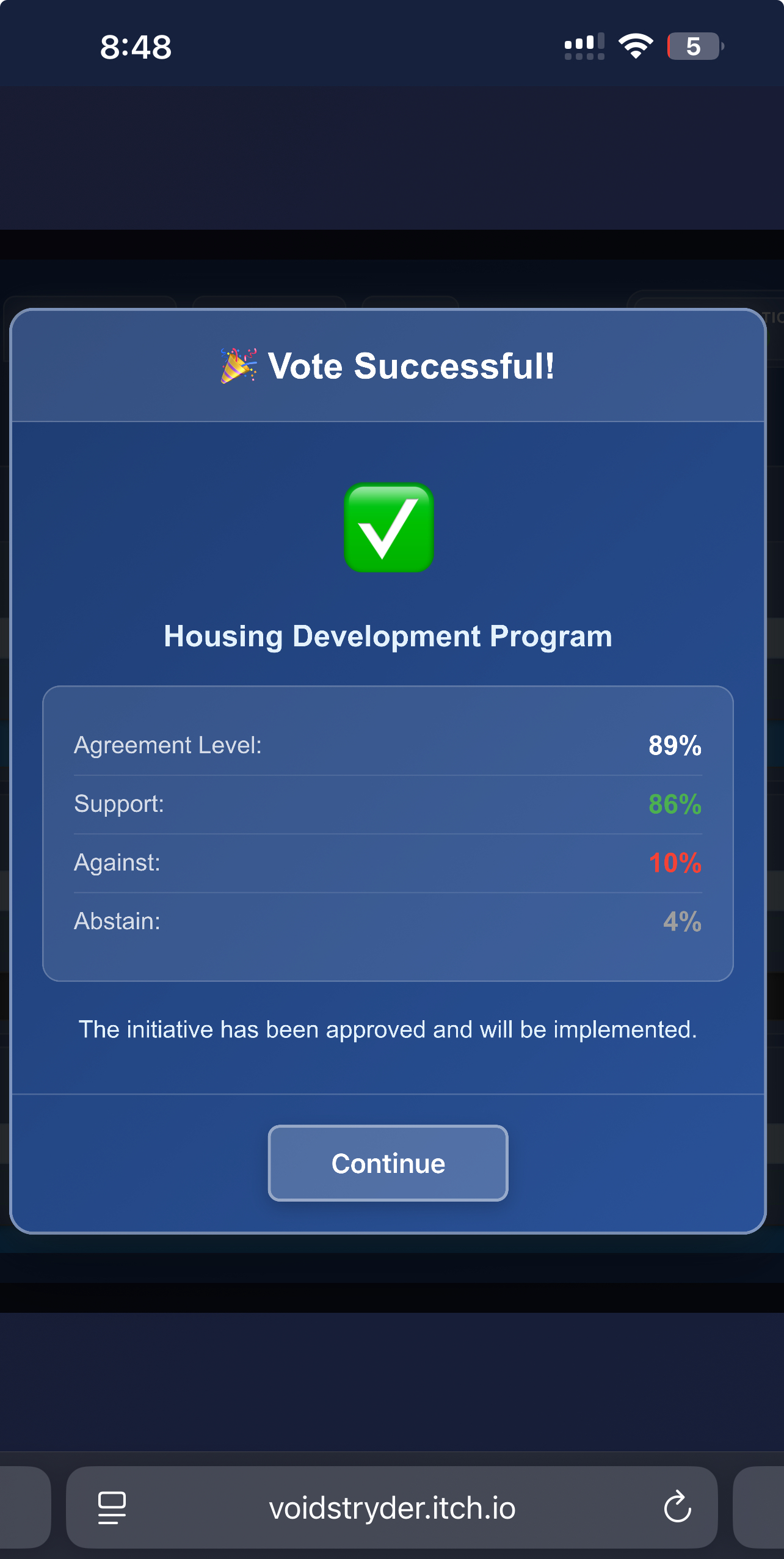 1) the voting tool will become a super helpful IRL tool if you can allow players to actually customize the inputs for their own criteria and actual presence according to the will of the particular body politic that’s utilizing your game