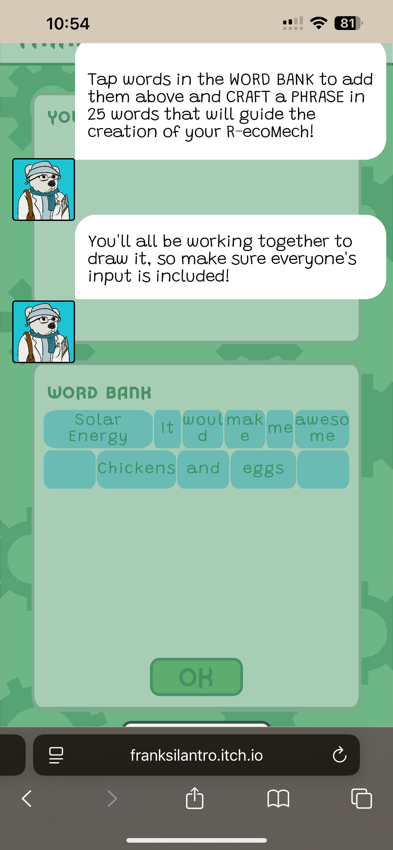 I really liked where this game was going thematically and mechanically … with the need to have eco friendly robots … I’m all about that … and also very into creating game objects with words!! Rad :) I got stuck here tho: