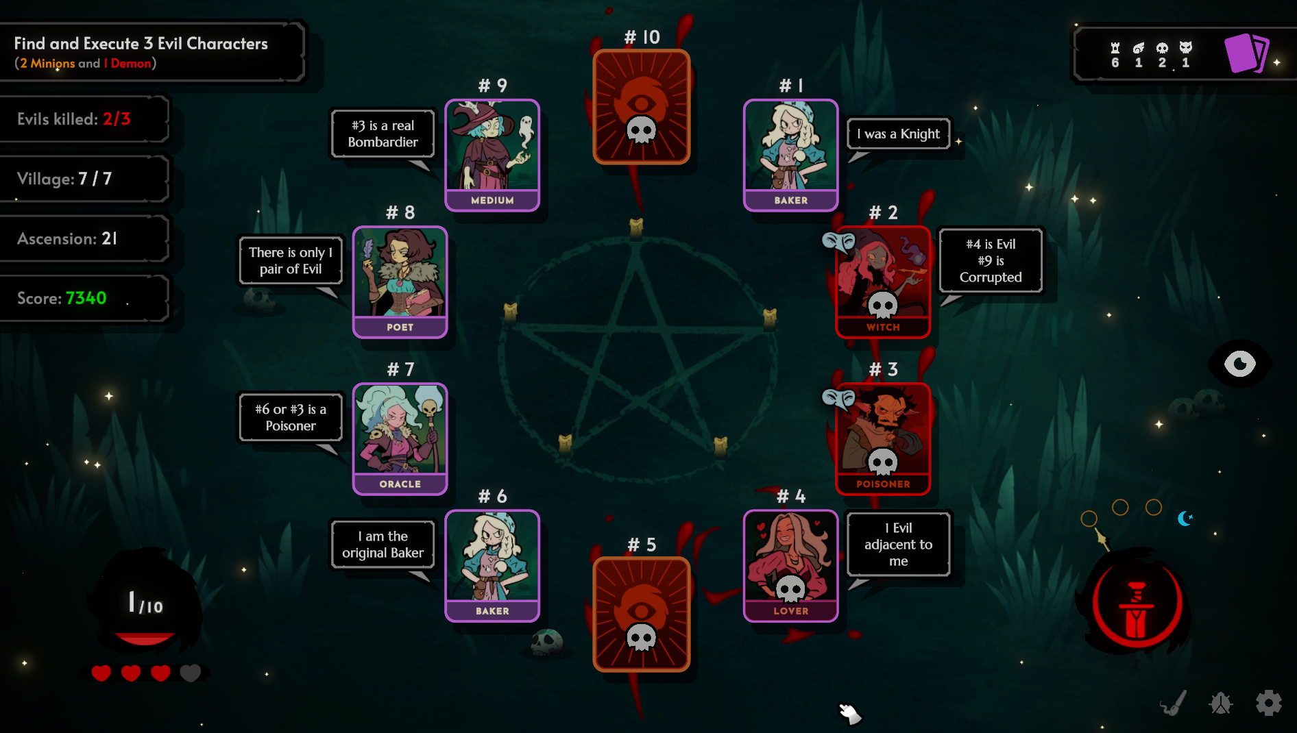 When there are 9 characters and Lilis kills at night, she kills the first person after four cards are revealed and takes 2 damage. Then, when the last card is revealed, the Big Eye appears a second time — it kills no one but still deals 2 damage, even if nobody dies. Should it really deal 2 damage if it doesn’t kill anyone?
