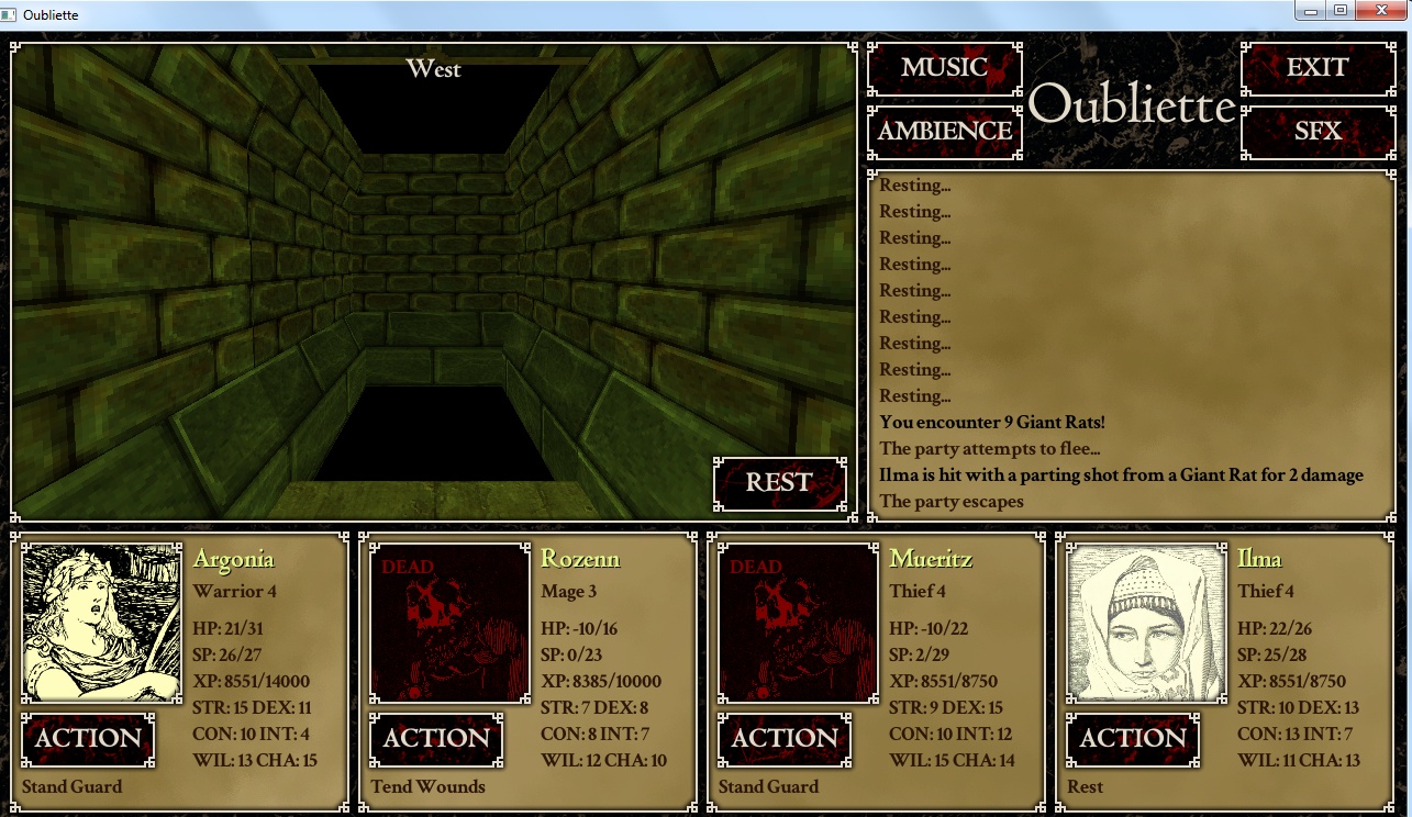 The biggest gripe is lack of actual feedback. It's computer program at its core and a little too little from a gameplay perspective. You click "fight" and all actions happen instantly and you don't know who got hit, when, why. A small red splash at the char pic is enough, same goes for enemies. Instead I'm just looking at the total number of enemies and quickly check if their pics isn't getting darker. Descriptions should differentiate between enemies attacking us and us attacking them. Text should be red, not only bold.