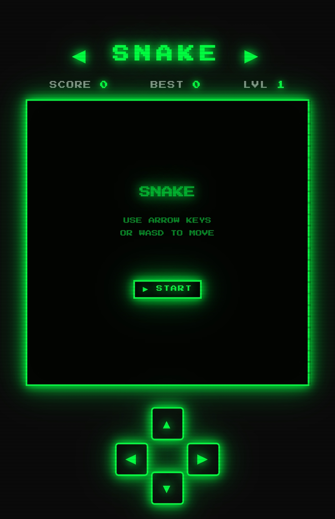Arrow keys, WASD, swipe gestures, or the on-screen D-pad all work. Space pauses.