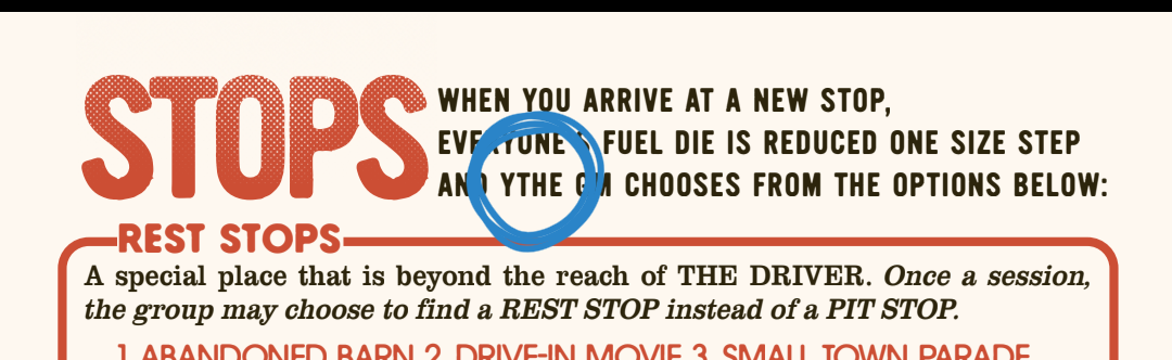 4. For the "Detoured" Reward on page 20, the rule says when players escape, they "increase their FUEL DICE 1 step". This seemed a bit confusing cause I thought about if a player is already at a full d12. Maybe it could be rephrased to something like "restore their FUEL DIE one step if it was damaged"?