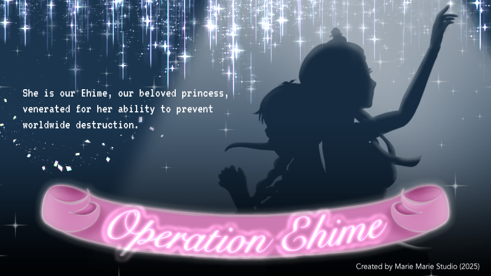 Play as Tachibana Yuuta (name can be customised), an agent working for a mysterious, multinational organisation which has information on the history and powers of one elusive being -- a magical girl who always appears at times when the Earth is facing danger from the cosmos. After a long period of searching all over the world for this being, one last candidate remains, and you have been entrusted with the task of assessing whether this candidate is her true incarnation. You have been entrusted with OPERATION EHIME.