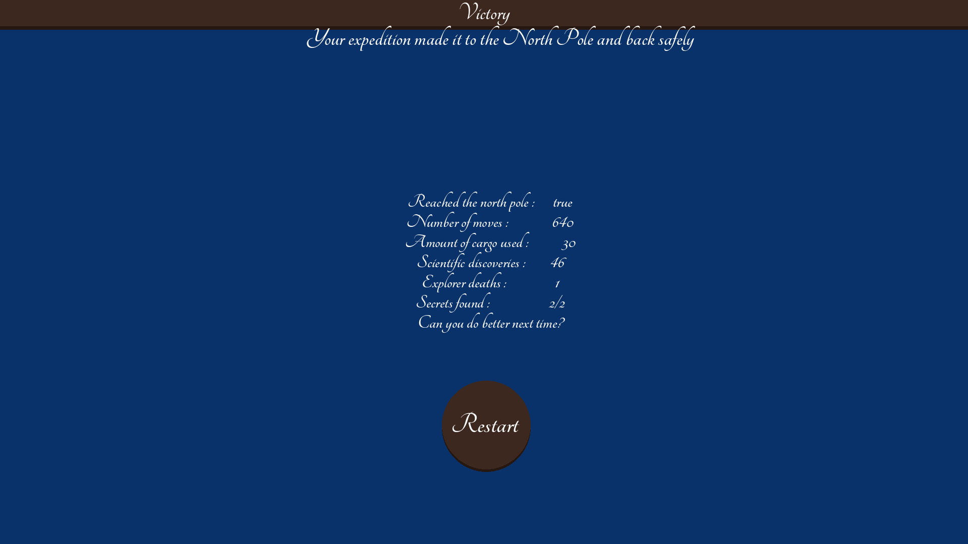 I really like the game design on this one! Using the supply camps to build a path that you then use to get further and further feels very realistic and rewarding at the same time. The map seemed to get a bit cropped on the sides and top on my screen though so that prevented me for exploring all of it (my screen is 1920x1080). A thing I would have liked to be able to do is to change which explorers were holding each cards, in general that mechanic was a bit weird, but it was a cool way to distribute tasks to each of them. Overall, great work!