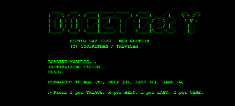 This a Prototype Medical Simulation plus game made by Toolkitman with help of Copilot by the base of Doctor Say2026 for Apple ii made by me and Daniel Henderson.