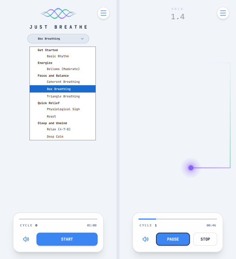 A minimalist breathing companion for managing stress and focus. Choose from presets and visualization modes to suit your mood.