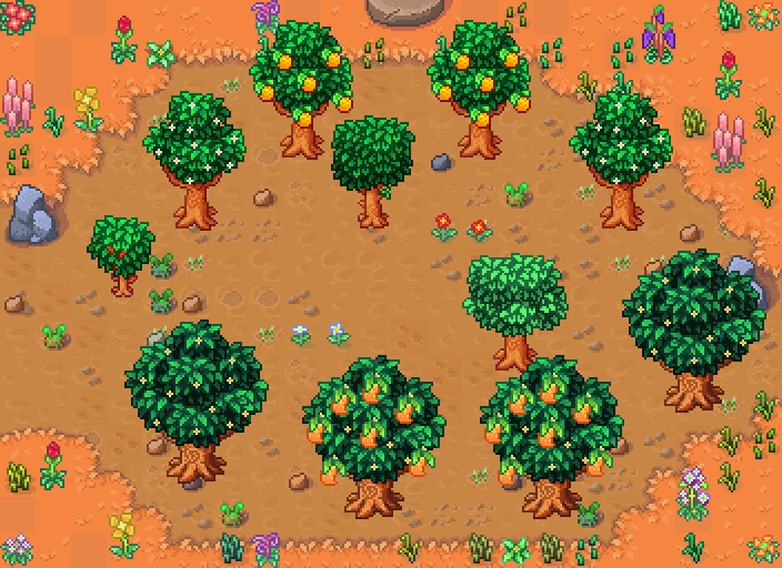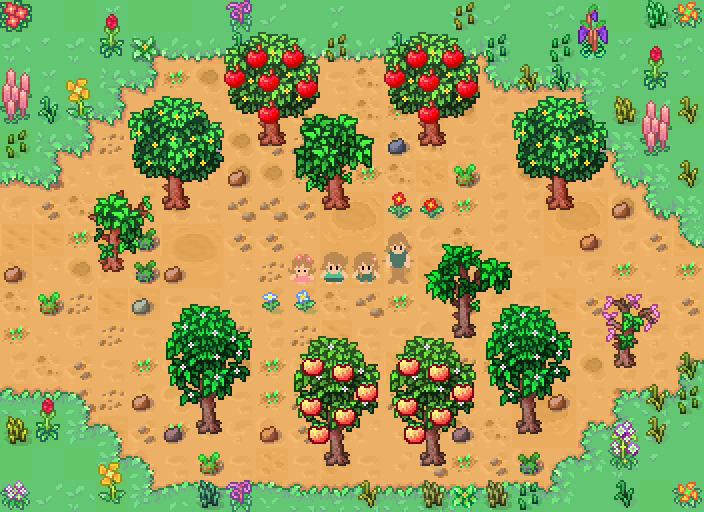 Fruit tree has growth stages from sapling 1 to 5 stages, harvesting stage, regrow stage, Fruit flower sprites.