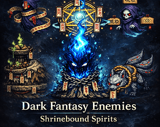 Shrine-themed spirit and construct enemies inspired by talismans, sacred ropes, and dark ritual imagery.