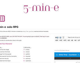 Dear yenofven, I made a Notion template so people can play your RPG and have a logbook directly at hand. Please tell me, if this is okay for you or if I should delete it: https://melaeckenfels.notion.site/5-min-e-solo-RPG-2bbd72639a984e1ca3ac12d117c0c...