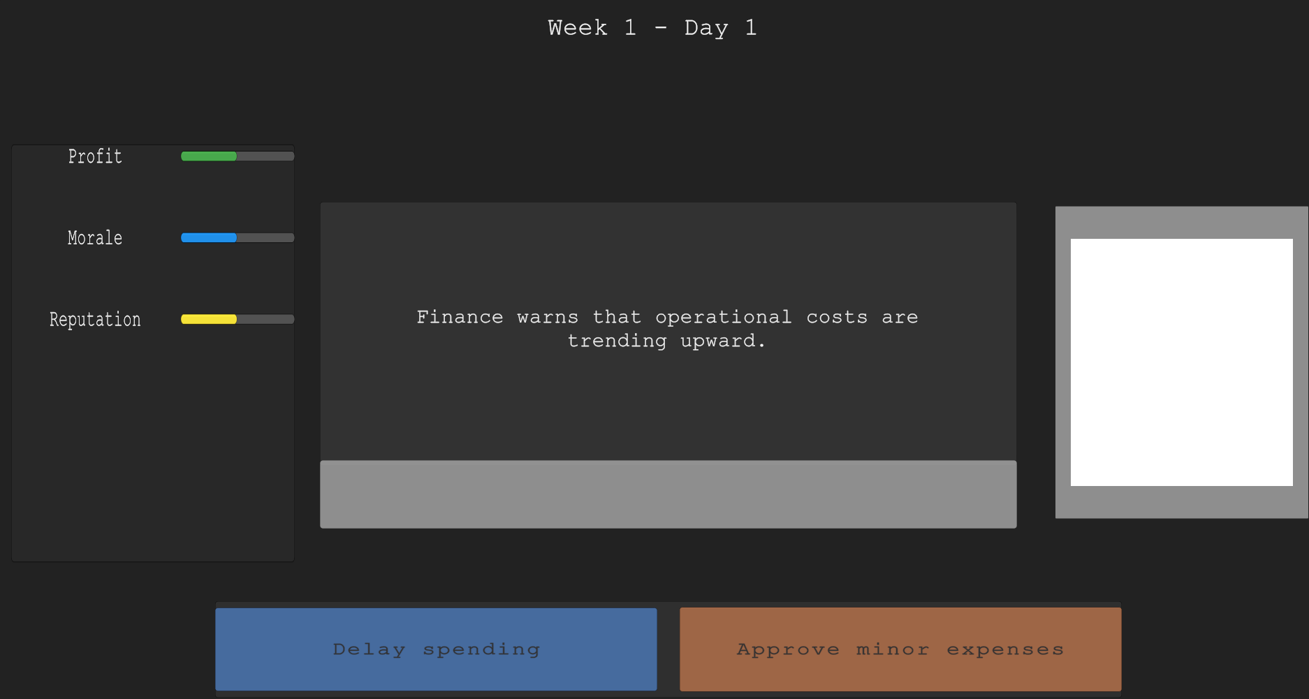 Every choice directly affects profit, morale, and reputation, and your decisions carry flags that shape the story. This prototype focuses on the core decision-making loop, giving a taste of the strategic office management experience: