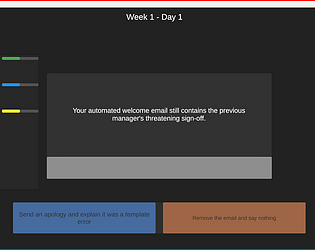 4 days of minor choices drawn from a pool of 8 possible events, testing your judgment and ability to keep the office running smoothly.