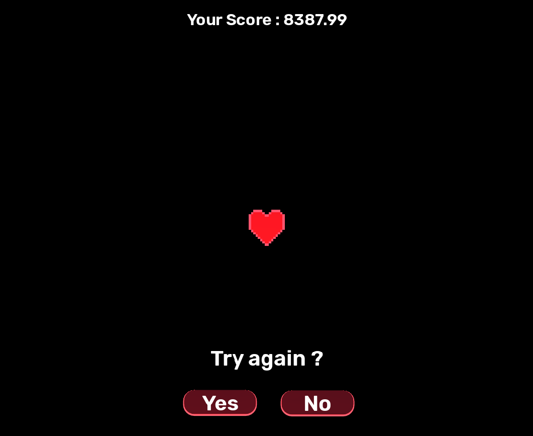 The palette is well chosen, and the player character is easy to recognize. I especially liked the short animation when you defeat a heart — it really highlights the feeling of success.