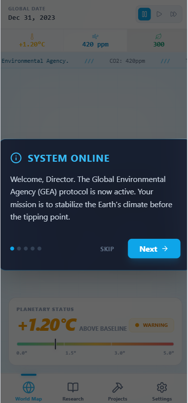- News Ticker: A real-time feed that reacts to your actions and the planet's health—from "Global leaders praise GEA" in successful timelines to "Martial law declared as water wars begin" in failing ones.