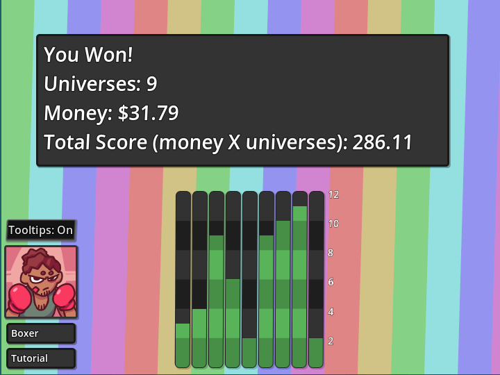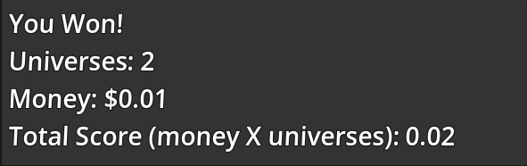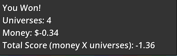 As an example of what is meant, a Nubby universe gives you an extra dollar after each round if you win. I built a random collection of objects without too much deckbuilding strategy, bought a nubby before the first fight, and I scored 955.05.
