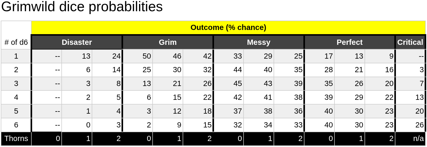 # of d6,Outcome (% chance),,,,,,,,,,,,