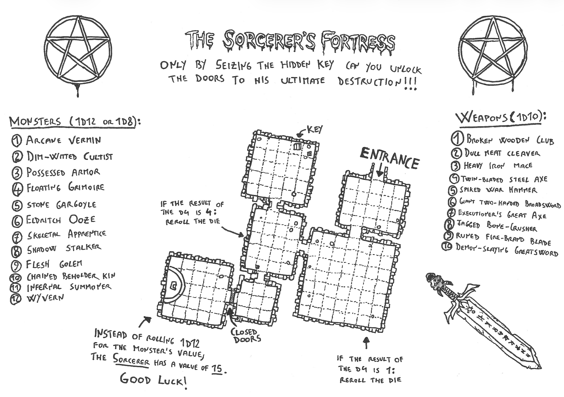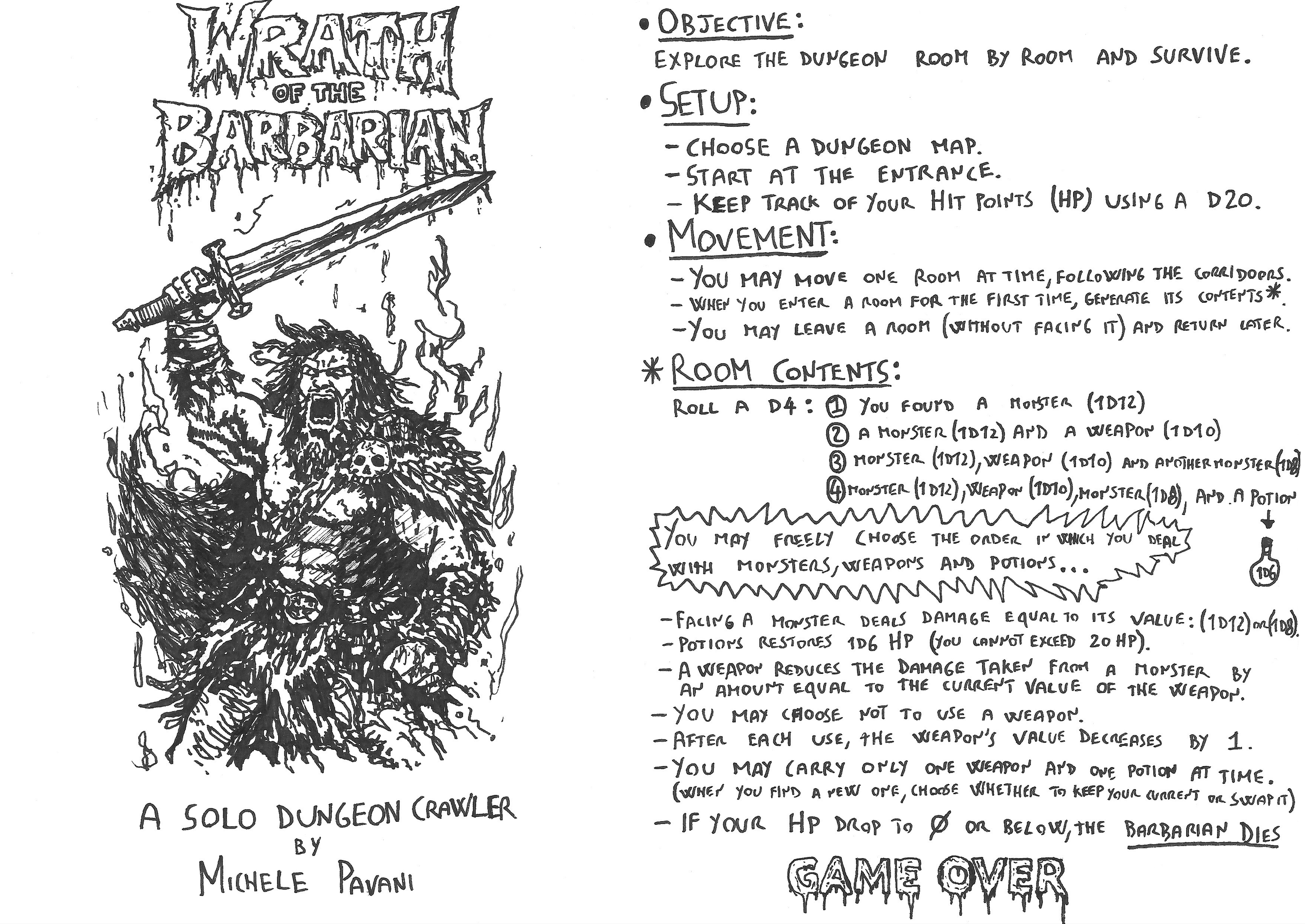 Hi everyone, I'd like to share with you this print-and-play dungeon crawler that I made entirely by hand (literally: written, drawn, and photocopied by hand): https://michele-pavani.itch.io/wrath-of-the-barbarian