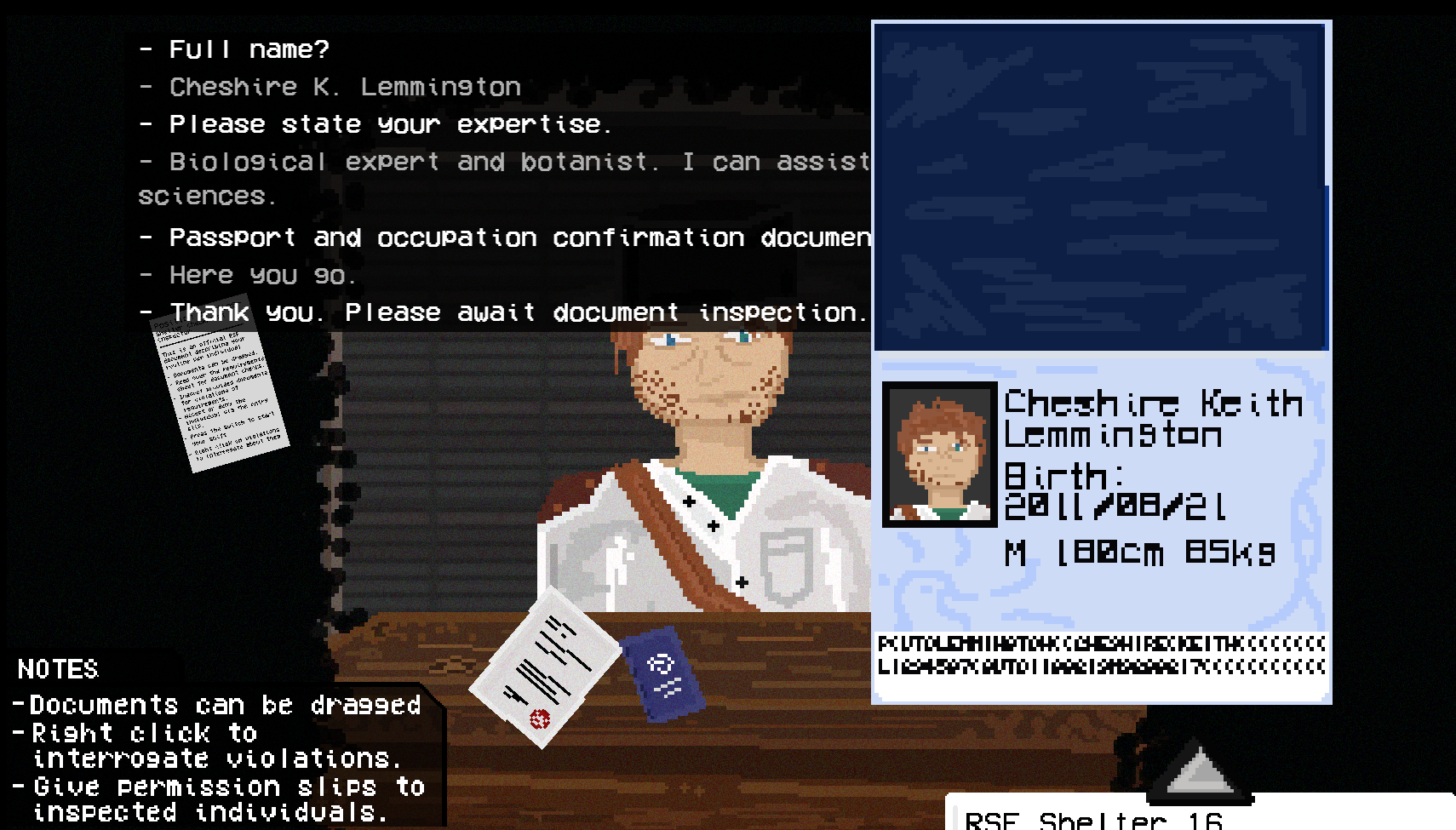 A short, 20 minute horror experience of filing through documents and passports in search of forgeries, discrepancies, and false information. Don't let anomalies in. The safety of Shelter 16 lies in your hands and your hands alone.
