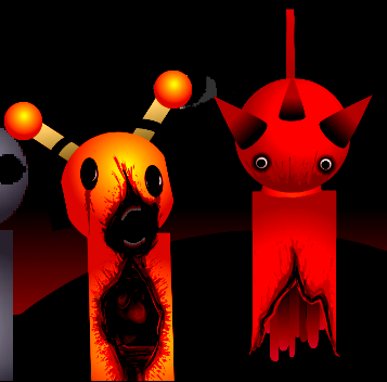 And also make the designs uncanny, scary, gory, and idk get some references to roblox classic horror games and roblox args, idkk