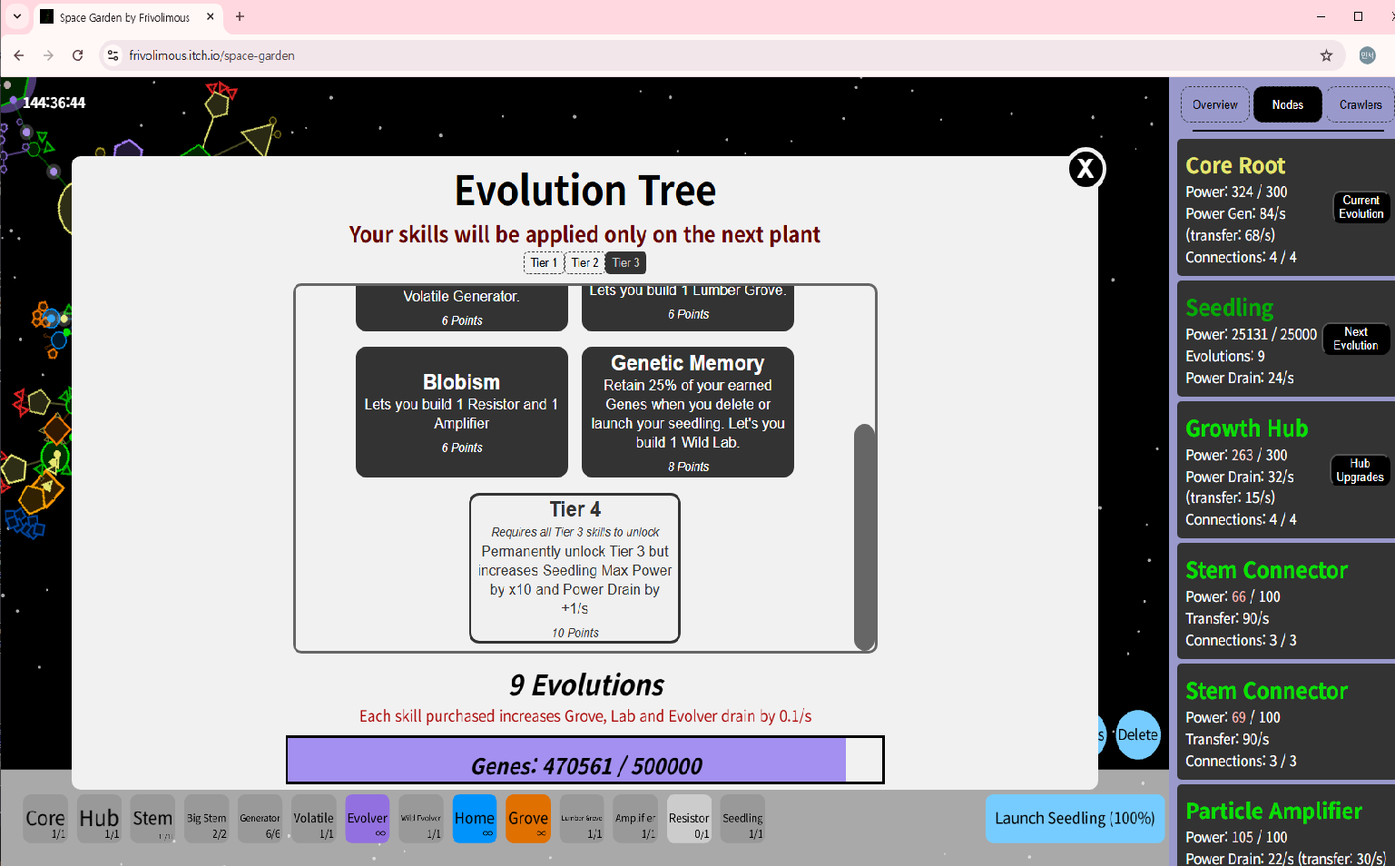 way to tier 4 is way toooooo harsh! i idled for 2 days and got only 2 gens of 10. and the cost of each gene is incrementing. moreover, the game crashes cause of memory overload every day. seems like i have to grind for over month to proceed furthermore.