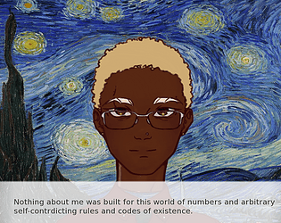 I did kinda assume that the target audience was trans men so it wasn't a fun surprise to be forced into the main character's perspective and i found myself cringing a lot at the start (not necessarily bad lol, presumably that's the point) but it would've been nice to have options for the player I think and more opportunities for input/interaction - i was expecting more of a traditional visual novel than a kinetic(? is that the term) thingy.