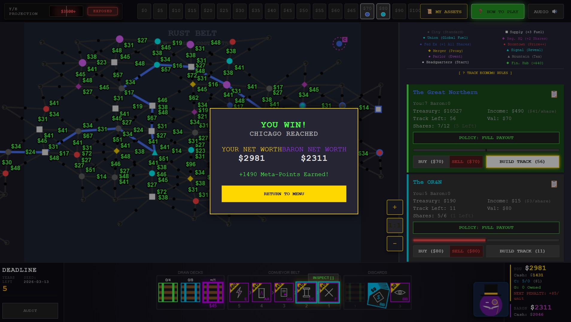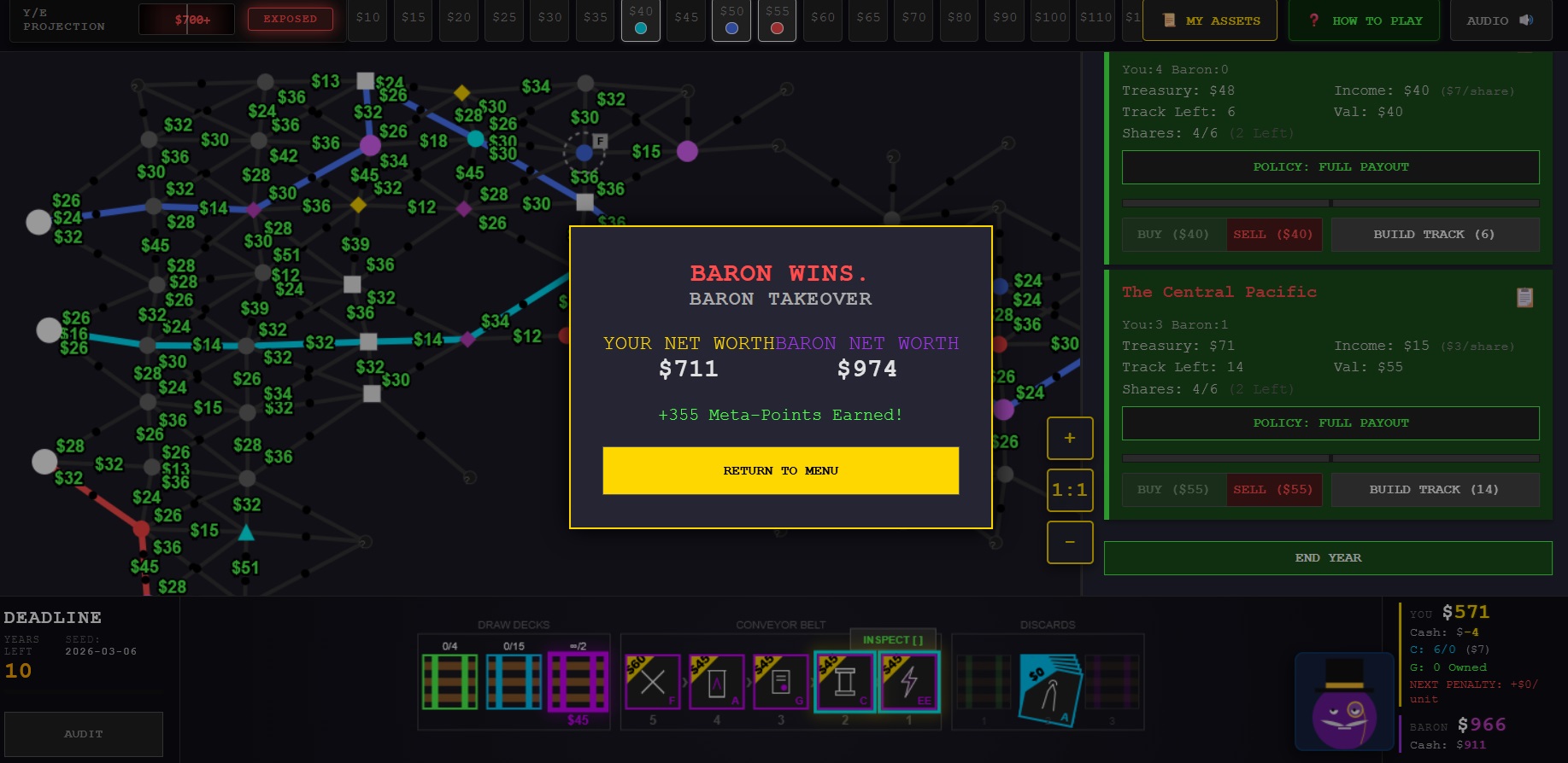 Developer Strat Hint: Try staying under the $300 Net Worth limit early on. Cycle your Green cards, then just end the year. You'll eat the penalty for the unbuilt Blue cards, but they become Green cards for round 2. By doing this, you starve the Baron of the terrain kickbacks he normally gets from Blue cards, and if you hit a Parlor to upgrade your Green cards, you can set yourself up for a massive early game push.