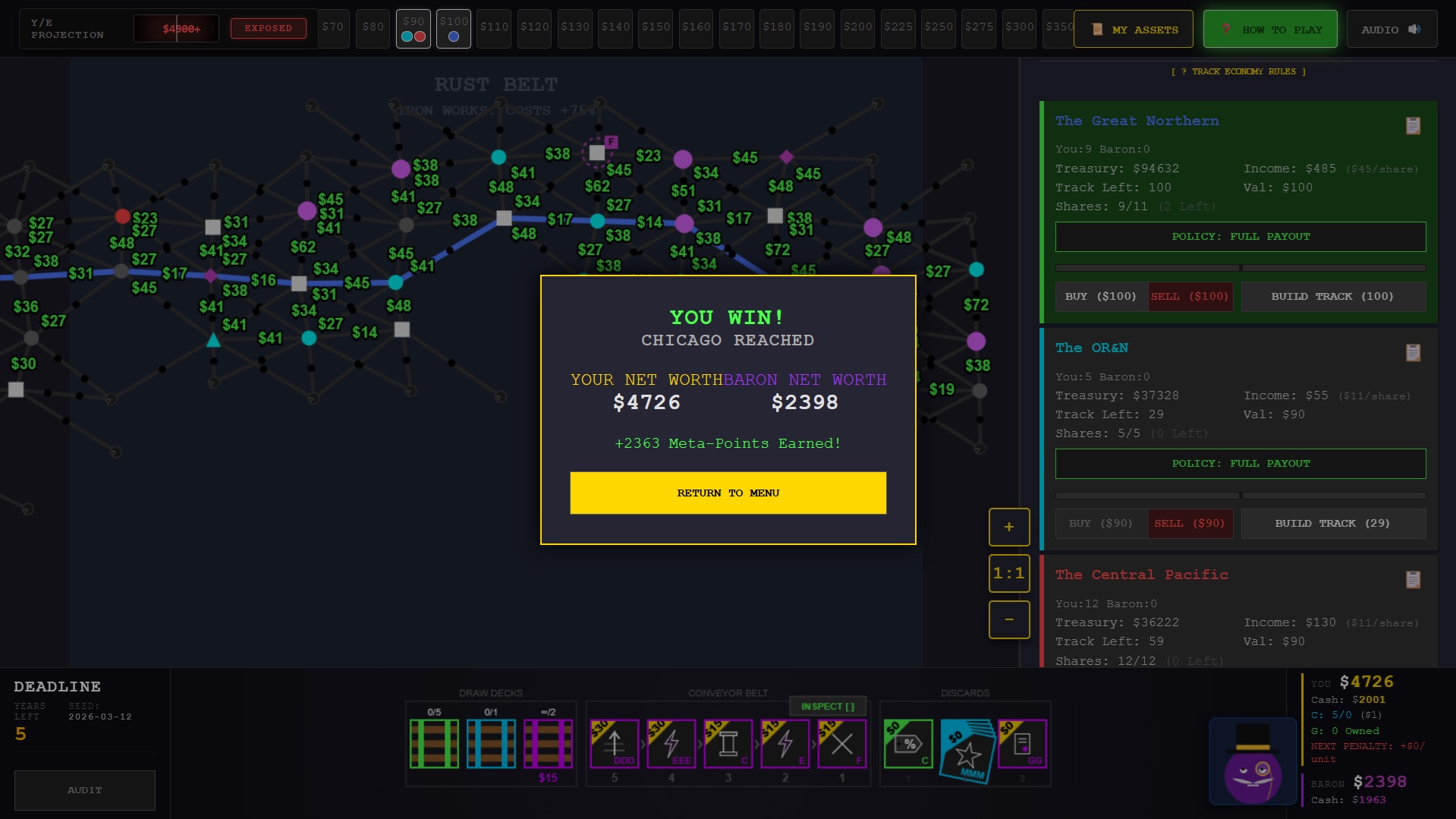 Thanks so much for playing, and for taking the time to leave this feedback! You raise a fantastic point—the game's financials and strategic layers are intentionally a bit opaque because I want players to discover the depth, but the mechanics of how things resolve absolutely need to be crystal clear. I completely agree that the rulebook needs a more rigid, "algorithmic" breakdown of the steps. Better end-of-year explanations and updates to the perk store are definitely on the to-do list!