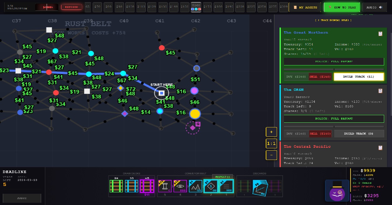 To answer your question: yes, going into negative track is actually intentional right now! We noticed it very early in development. It originally stemmed from a quirk in the code—the UI only checks if a company has more than zero track to let you click the 'Build' button. When the backend actually executes the build, it rigorously checks if you have the cash, but it just subtracts the distance from your track inventory without a hard stop at zero. So, if you have 1 track left and build a 2-length segment, it lets you stretch into -1.