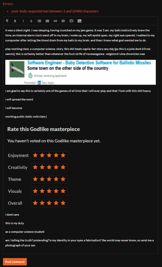 I'll mirror a sentiment from the previous comment and state that it probably took too long for the fight to be over because of the clicking. Great writing too! You've made basically an entire production-quality game just by yourself solo in a span of 4.5 days. Rieux, do you know how abso-fucking-lutely insane that is?! Hold your head up high, man!!
