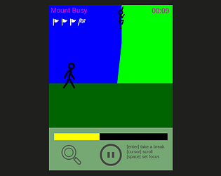 Reach the top of the mountain while running away from the chaser! But be careful, you die when your fatigue gauge is full! So you have to rest from time to time by clicking 'rest button' or [enter key].