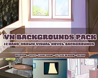 12 Hand-Drawn Visual Novel Backgrounds: Bedroom, Office, Living Room, Prison, Outside Window (with Time Variants)