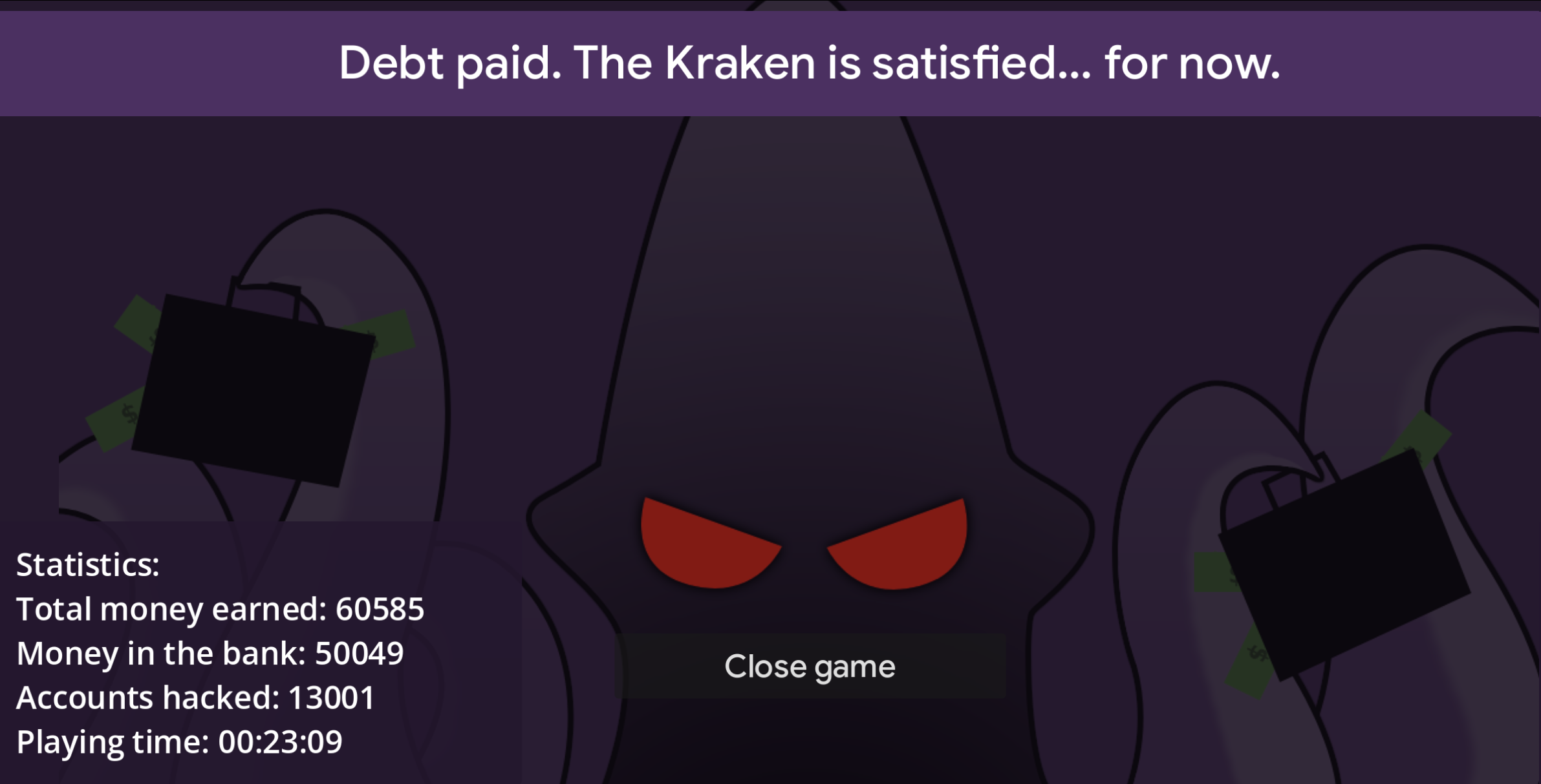 Really big fan of the UI and the incremental nature of your game! Fits really well with the theme and is very fun to play! The KrakenVPN I did have to close and re-open to see what server the FBI shut down, but other than that it was a fun experience opening windows and setting up my servers to phish!