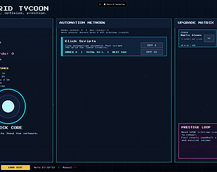 A clean neon-style idle upgrade system with 3 currencies, auto-scaling costs, and click + idle income