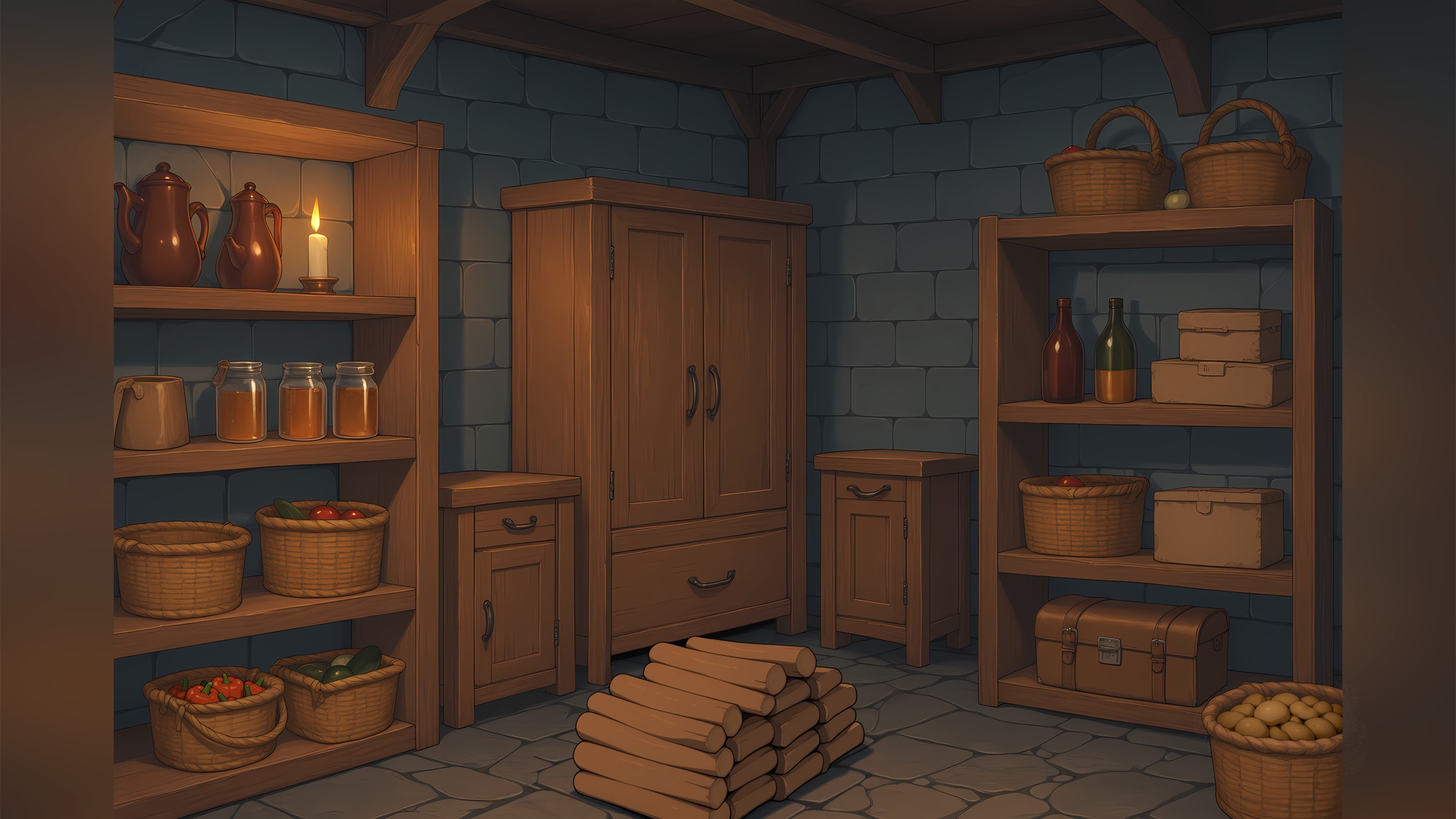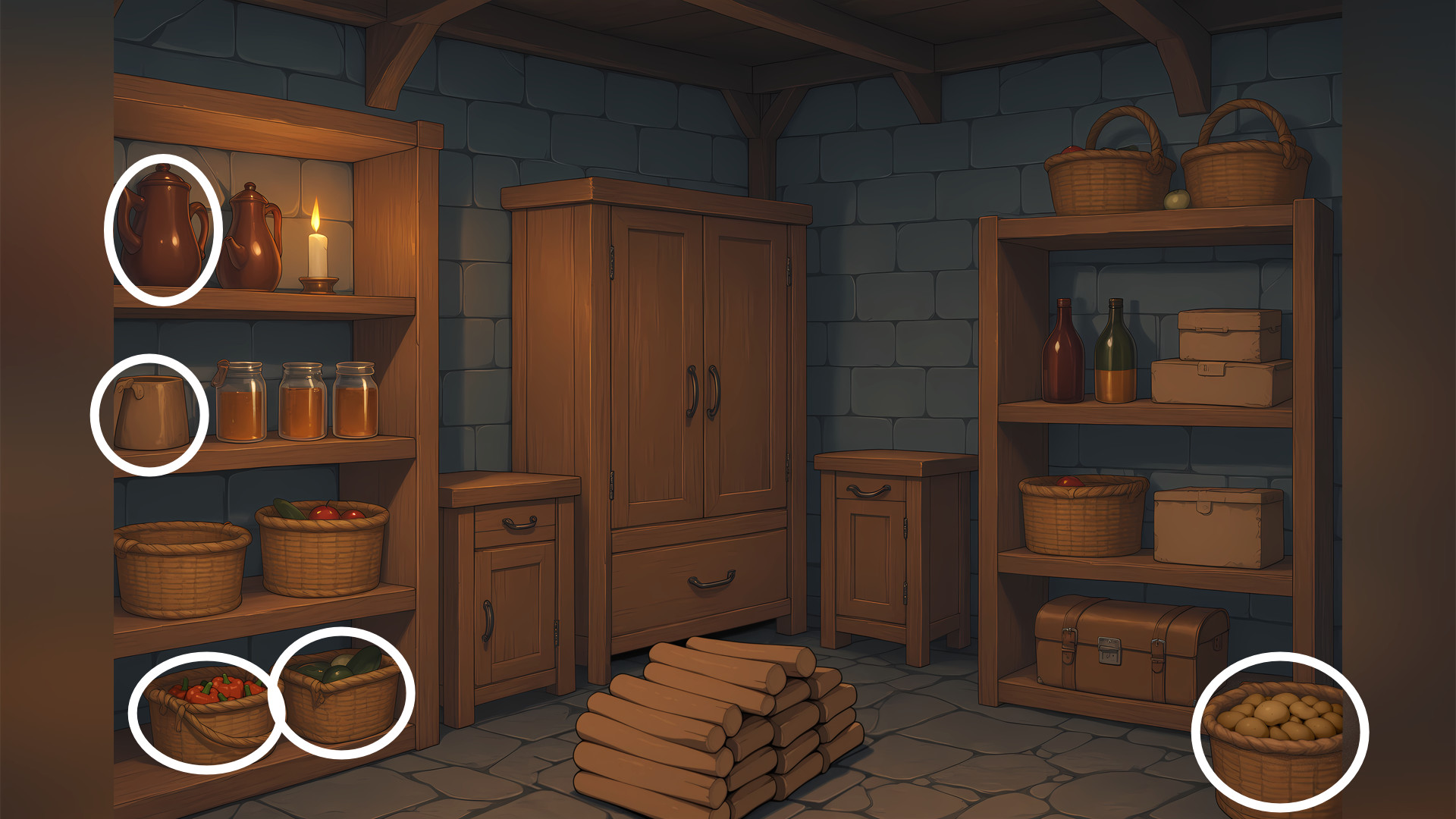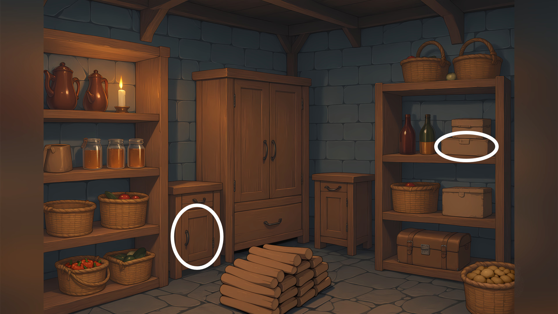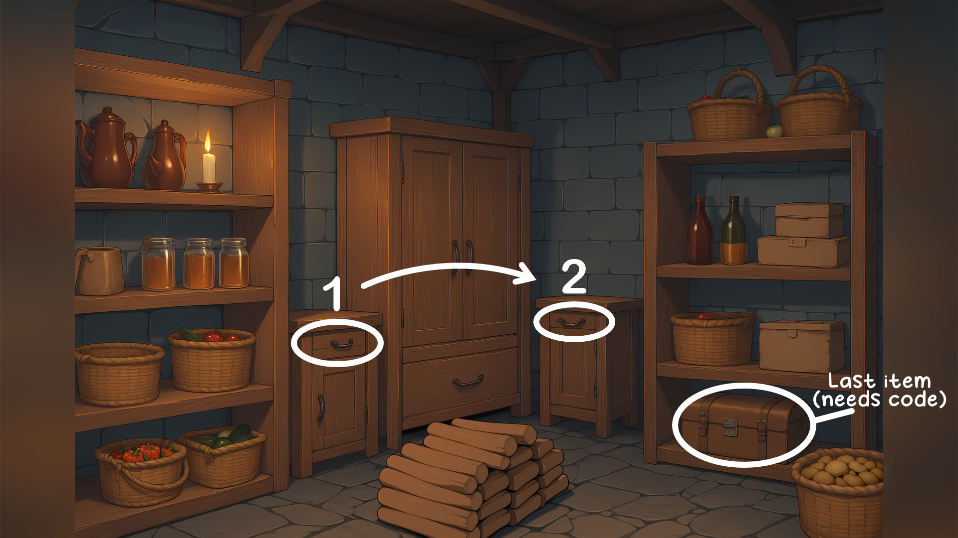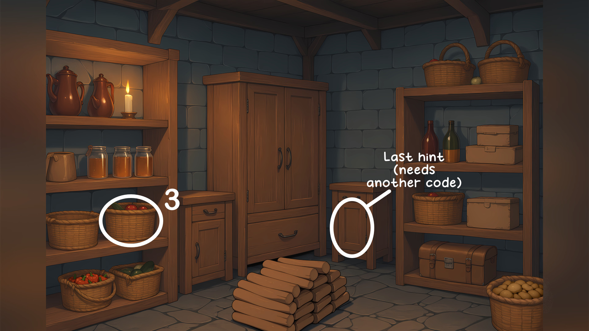The last hint is in the lower cupboard on the right side, but it's locked with a mechanism that requires some sort of code.The corresponding code is in the basket (no. 3), but the paper with the code is buried all the way under the apples (and cucumber). Is there any place where you could transfer the contents of the basket into?
