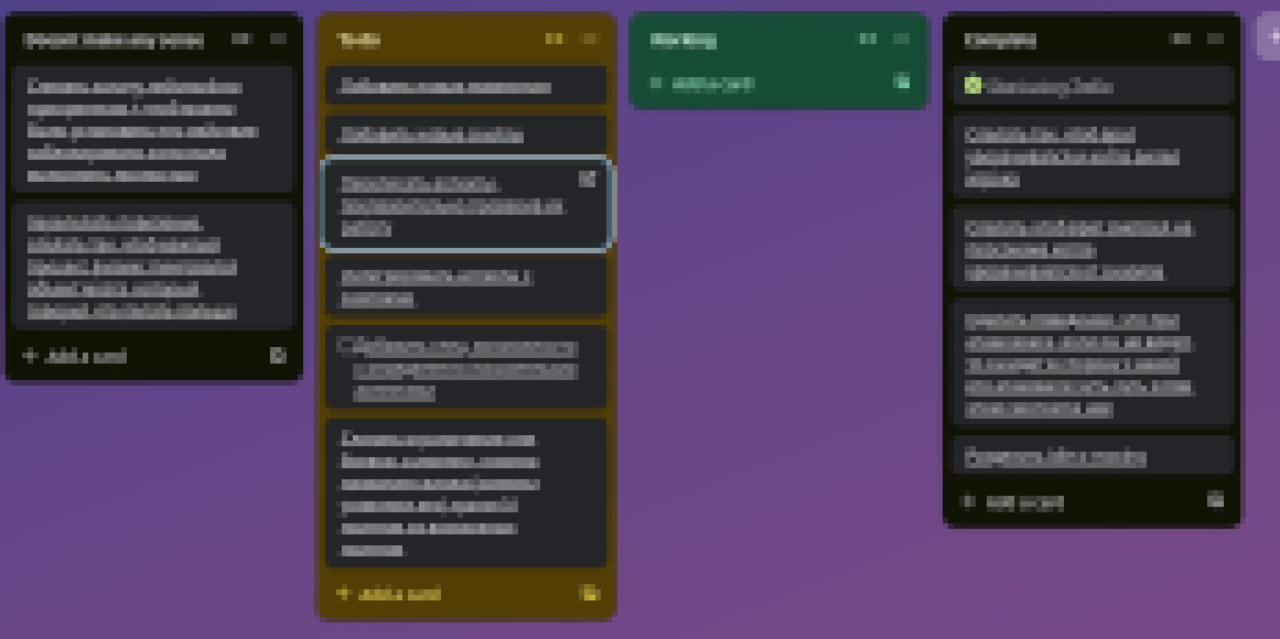 Okay, and the first thing I want to share is that I recently decided to start using task boards—just a couple of days ago, actually. Mine already looks like this, and it’s pretty convenient for keeping me grounded instead of daydreaming and running around wondering what to do next. This is the second tool I didn’t really want to adopt for some reason—the first one was the design doc.