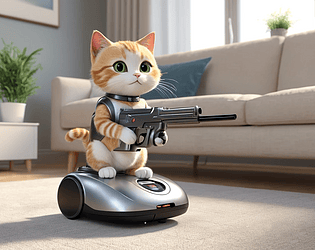 Join the adventure of a playful cat riding a robot hoover, armed with a ball launcher to battle invading dust balls.