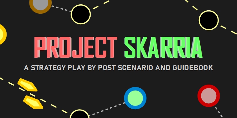Project Skarria is a game manual and guidebook for the Skarria round-based play-by-post game and setting. This rules-light game system is designed for asynchronous strategic games, for players who may be too busy to read through a manual of rules but want to negotiate interstellar trade agreements on their lunch breaks.